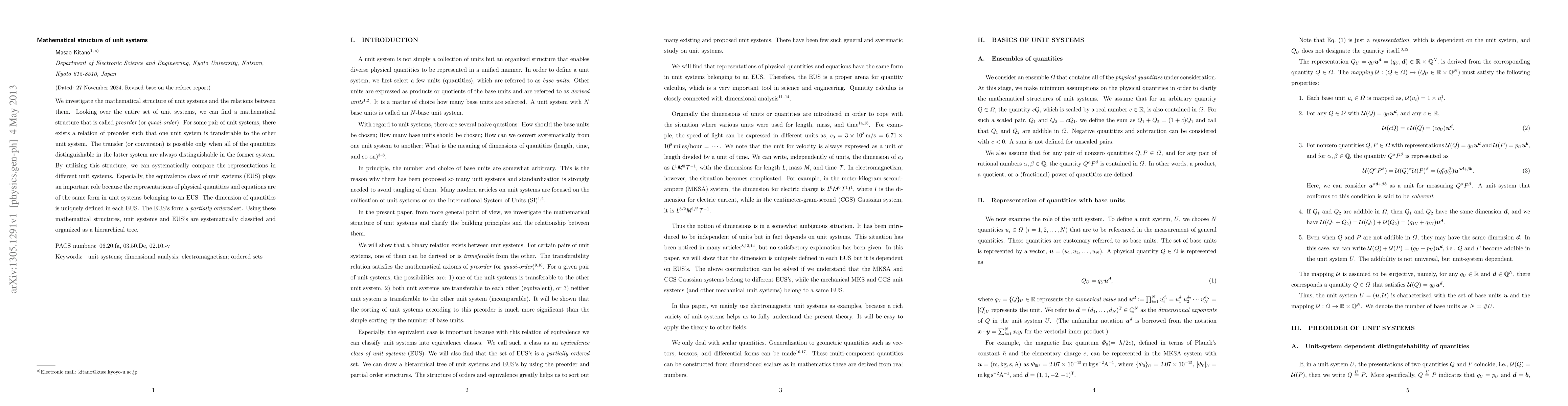 This paper explores the mathematical structure of unit systems, identifying a preorder relation that allows for the transfer between systems when one system can distinguish all quantities of the other. It highlights the equivalence class of unit systems (EUS), which maintains consistent representations and dimensions, forming a partially ordered set that organizes unit systems hierarchically.