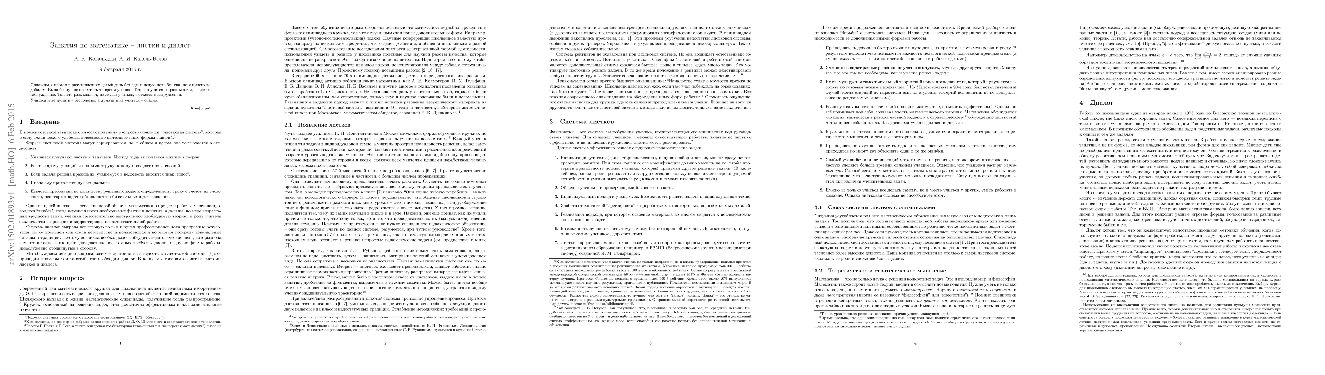 The paper discusses the "listki" system in Russian mathematical education, highlighting its benefits and drawbacks, particularly its inadequacies in fostering theoretical thinking. It suggests complementing this system with dialogic methods, especially in subjects like information theory, algebra, and non-Euclidean geometry.
