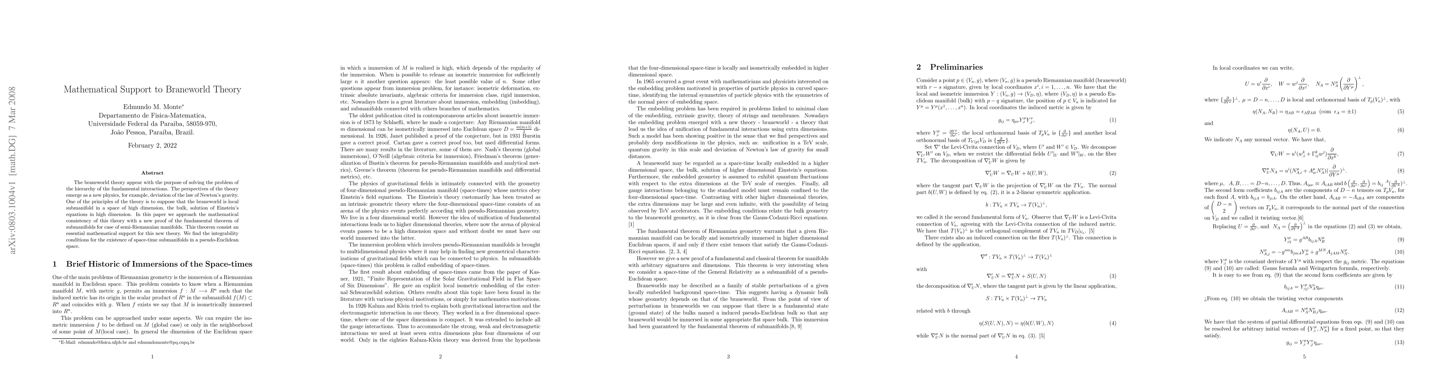 The braneworld theory appear with the purpose of solving the problem of the hierarchy of the fundamental interactions. The perspectives of the theory emerge as a new physics, for example, deviation of the law of Newton's gravity. One of the principles of the theory is to suppose that the braneworld is local submanifold in a space of high dimension, the bulk, solution of Einstein's equations in high dimension. In this paper we approach the mathematical consistency of this theory with a new proof of the fundamental theorem of submanifolds for case of semi-Riemannian manifolds. This theorem consist an essential mathematical support for this new theory. We find the integrability conditions for the existence of space-time submanifolds in a pseudo-Euclidean space. Keywords: Submanifolds, Braneworld, Pseudo-Riemannian geometry