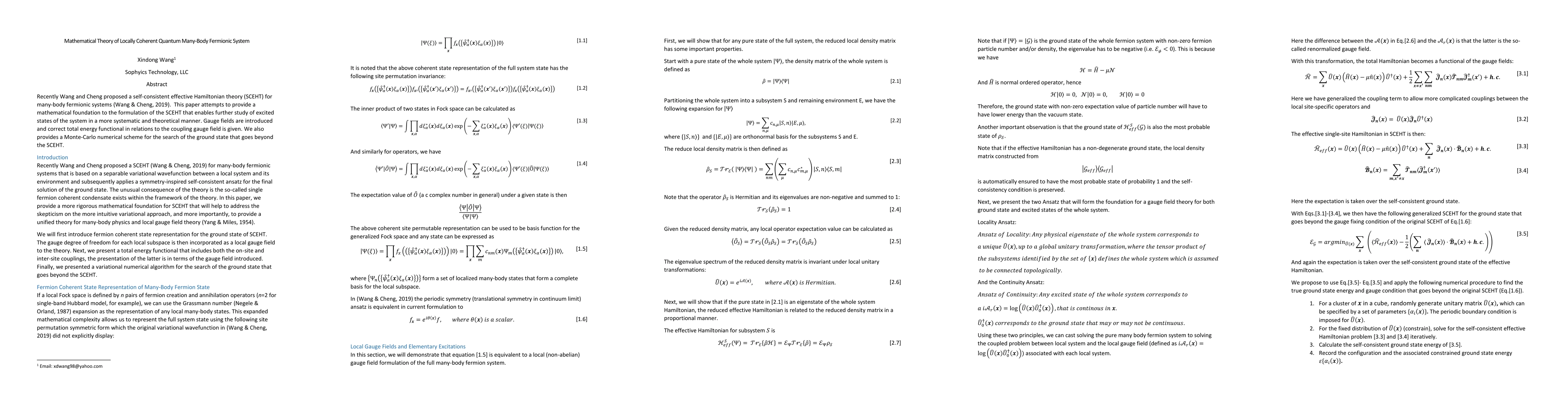 Recently Wang and Cheng proposed a self-consistent effective Hamiltonian theory (SCEHT) for many-body fermionic systems (Wang & Cheng, 2019). This paper attempts to provide a mathematical foundation to the formulation of the SCEHT that enables further study of excited states of the system in a more systematic and theoretical manner. Gauge fields are introduced and correct total energy functional in relations to the coupling gauge field is given. We also provides a Monte-Carlo numerical scheme for the search of the ground state that goes beyond the SCEHT.