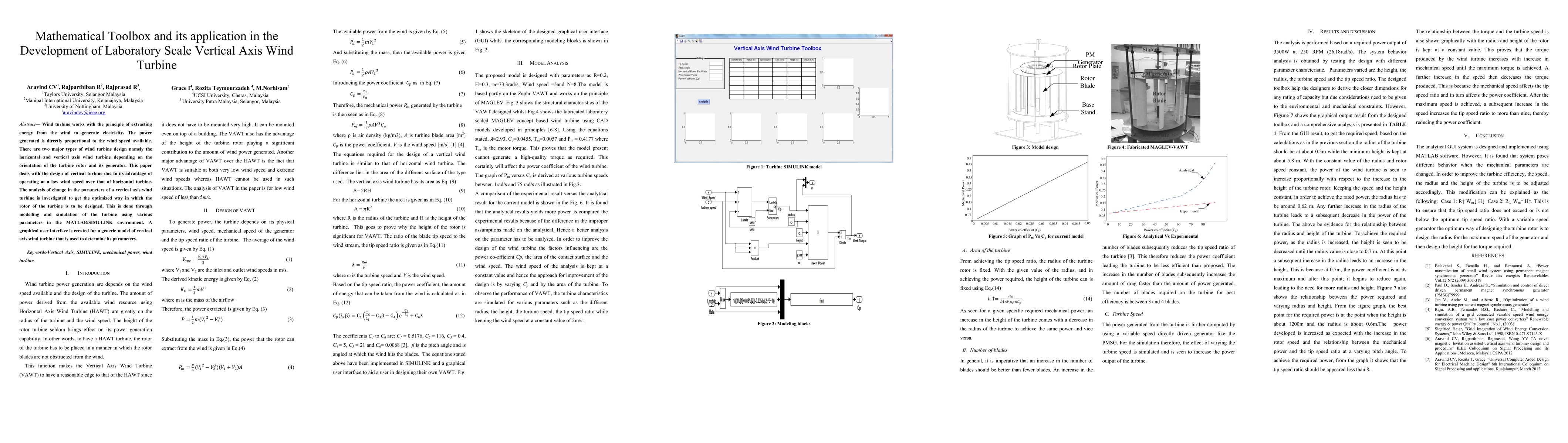 This paper explores the design and optimization of a vertical axis wind turbine using mathematical modeling and simulation in MATLAB/SIMULINK. The study aims to determine the optimal rotor design for efficient energy generation at low wind speeds through a graphical user interface.