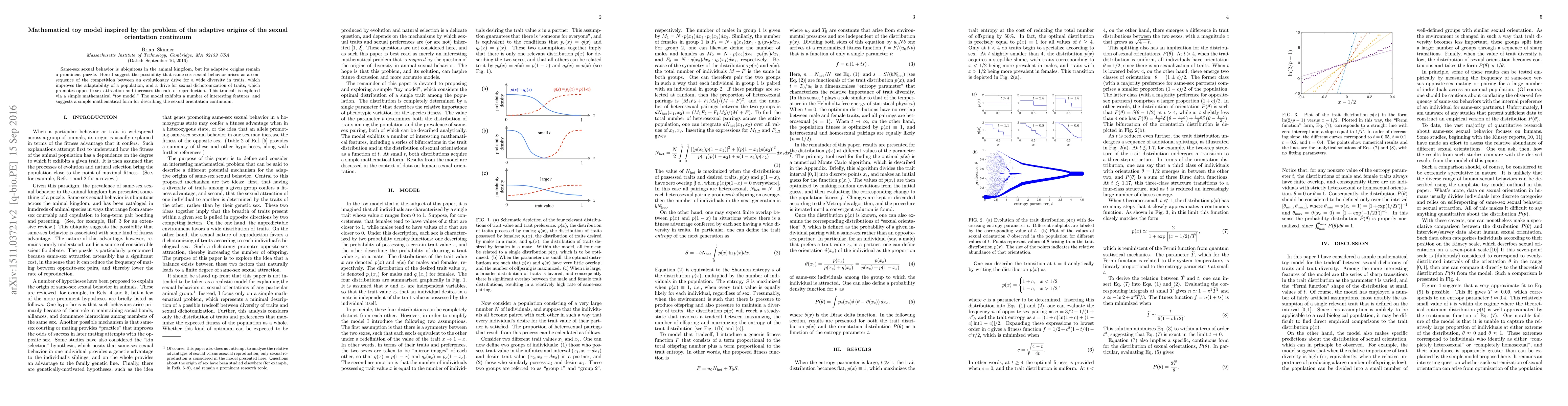 This paper proposes a mathematical toy model to explore the adaptive origins of same-sex sexual behavior, suggesting it arises from a balance between evolutionary diversity and sexual dichotomization. The model reveals interesting features and offers a mathematical framework for the sexual orientation continuum.