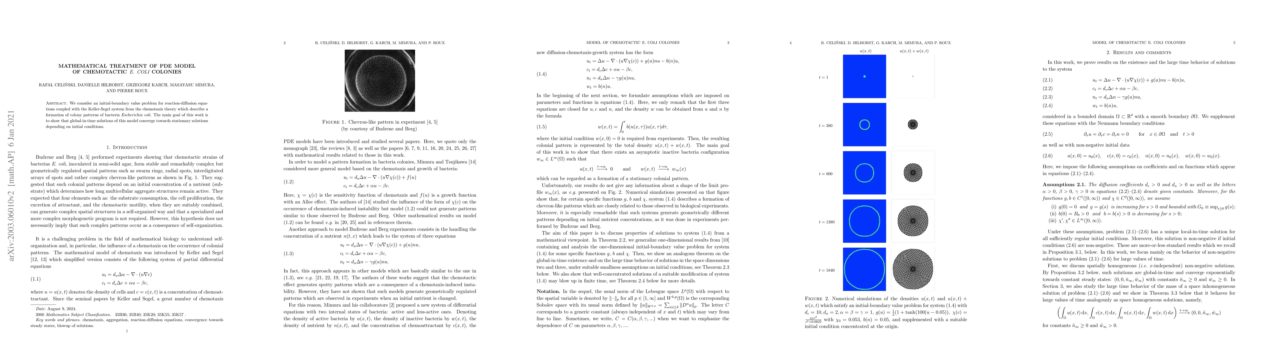 We consider an initial-boundary value problem describing the formation of colony patterns of bacteria Escherichia coli. This model consists of reaction-diffusion equations coupled with the Keller-Segel system from the chemotaxis theory in a bounded domain, supplemented with zero-flux boundary conditions and with non-negative initial data. We answer questions on the global in time existence of solutions as well as on their large time behaviour. Moreover, we show that solutions of a related model may blow up in a finite time.