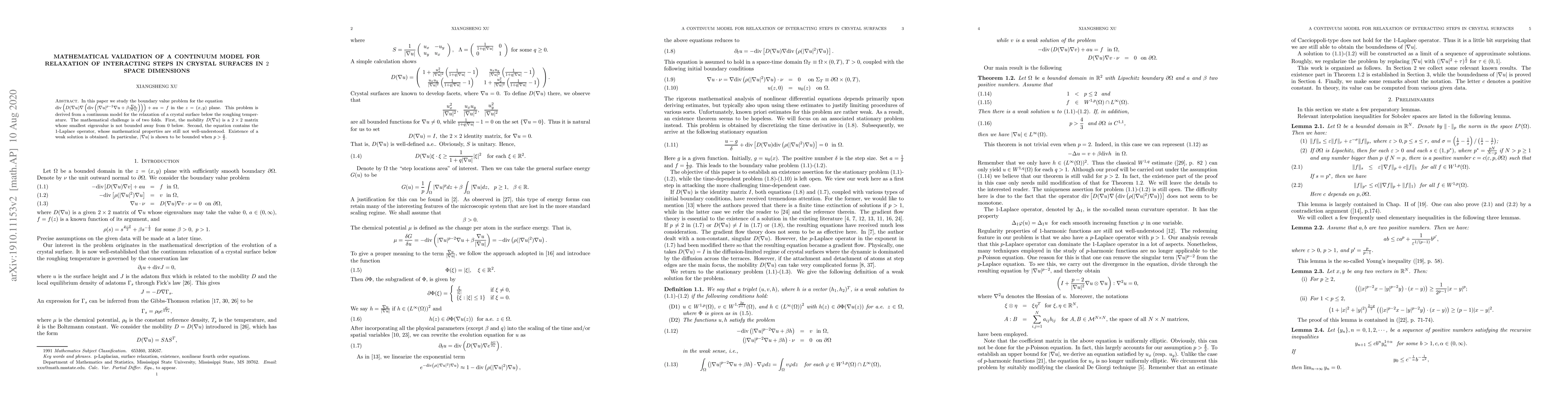 In this paper we study the boundary value problem for the equation $\mbox{div}\left(D(\nabla u)\nabla\left(\mbox{div}\left(|\nabla u|^{p-2}\nabla u+\beta\frac{\nabla u}{|\nabla u|}\right)\right)\right)+au=f$ in the $z=(x,y)$ plane. This problem is derived from a continuum model for the relaxation of a crystal surface below the roughing temperature. The mathematical challenge is of two folds. First, the mobility $D(\nabla u)$ is a $2\times 2$ matrix whose smallest eigenvalue is not bounded away from $0$ below. Second, the equation contains the $1$-Laplace operator, whose mathematical properties are still not well-understood. Existence of a weak solution is obtained. In particular, $|\nabla u|$ is shown to be bounded when $p>\frac{4}{3}$.