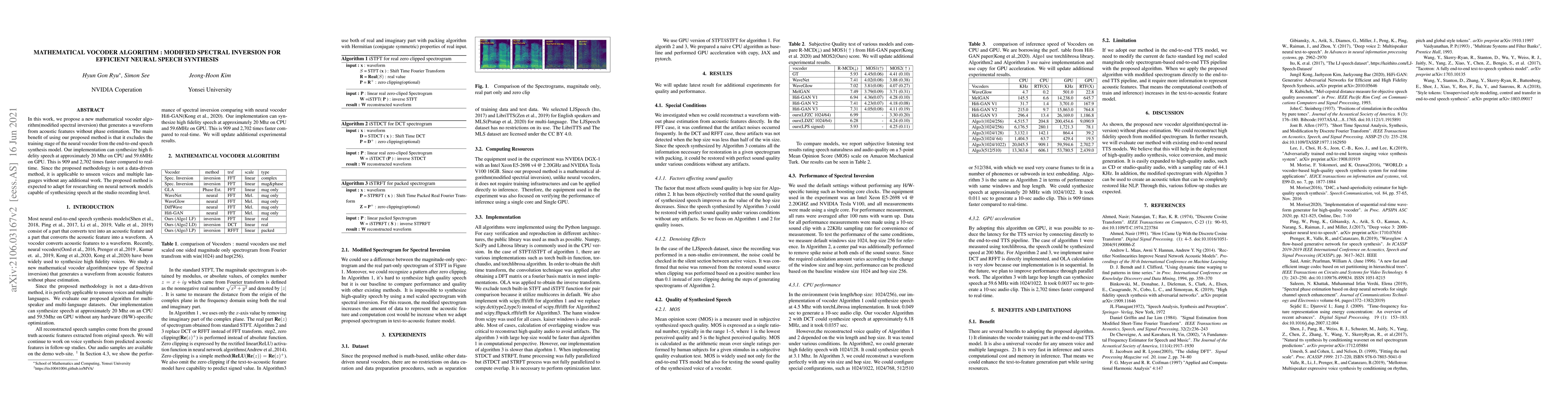 In this work, we propose a new mathematical vocoder algorithm(modified spectral inversion) that generates a waveform from acoustic features without phase estimation. The main benefit of using our proposed method is that it excludes the training stage of the neural vocoder from the end-to-end speech synthesis model. Our implementation can synthesize high fidelity speech at approximately 20 Mhz on CPU and 59.6MHz on GPU. This is 909 and 2,702 times faster compared to real-time. Since the proposed methodology is not a data-driven method, it is applicable to unseen voices and multiple languages without any additional work. The proposed method is expected to adapt for researching on neural network models capable of synthesizing speech at the studio recording level.