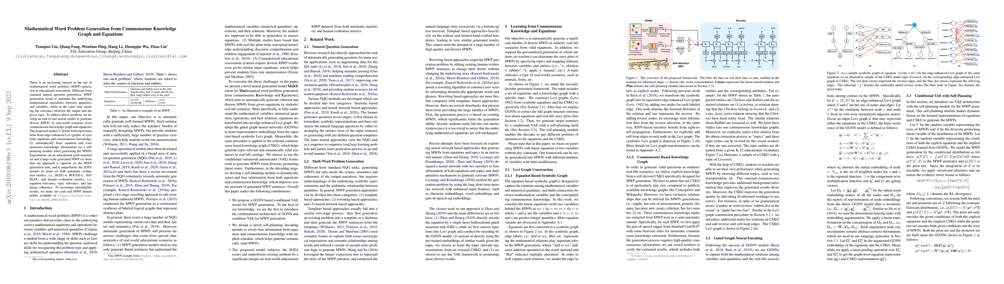 This research paper develops a neural model to generate diverse mathematical word problems from commonsense knowledge graphs and equations, outperforming state-of-the-art models in automatic evaluation metrics and human evaluation.