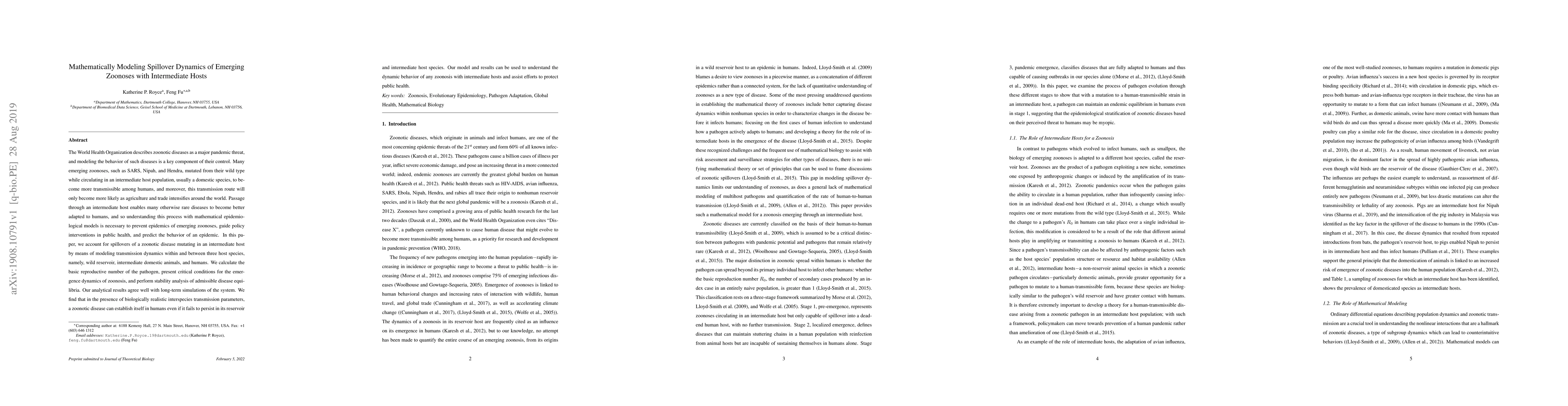 The World Health Organization describes zoonotic diseases as a major pandemic threat, and modeling the behavior of such diseases is a key component of their control. Many emerging zoonoses, such as SARS, Nipah, and Hendra, mutated from their wild type while circulating in an intermediate host population, usually a domestic species, to become more transmissible among humans, and moreover, this transmission route will only become more likely as agriculture and trade intensifies around the world. Passage through an intermediate host enables many otherwise rare diseases to become better adapted to humans, and so understanding this process with mathematical epidemiological models is necessary to prevent epidemics of emerging zoonoses, guide policy interventions in public health, and predict the behavior of an epidemic. In this paper, we account for spillovers of a zoonotic disease mutating in an intermediate host by means of modeling transmission dynamics within and between three host species, namely, wild reservoir, intermediate domestic animals, and humans. We calculate the basic reproductive number of the pathogen, present critical conditions for the emergence dynamics of zoonosis, and perform stability analysis of admissible disease equilibria. Our analytical results agree well with long-term simulations of the system. We find that in the presence of biologically realistic interspecies transmission parameters, a zoonotic disease can establish itself in humans even if it fails to persist in its reservoir and intermediate host species. Our model and results can be used to understand the dynamic behavior of any zoonosis with intermediate hosts and assist efforts to protect public health.