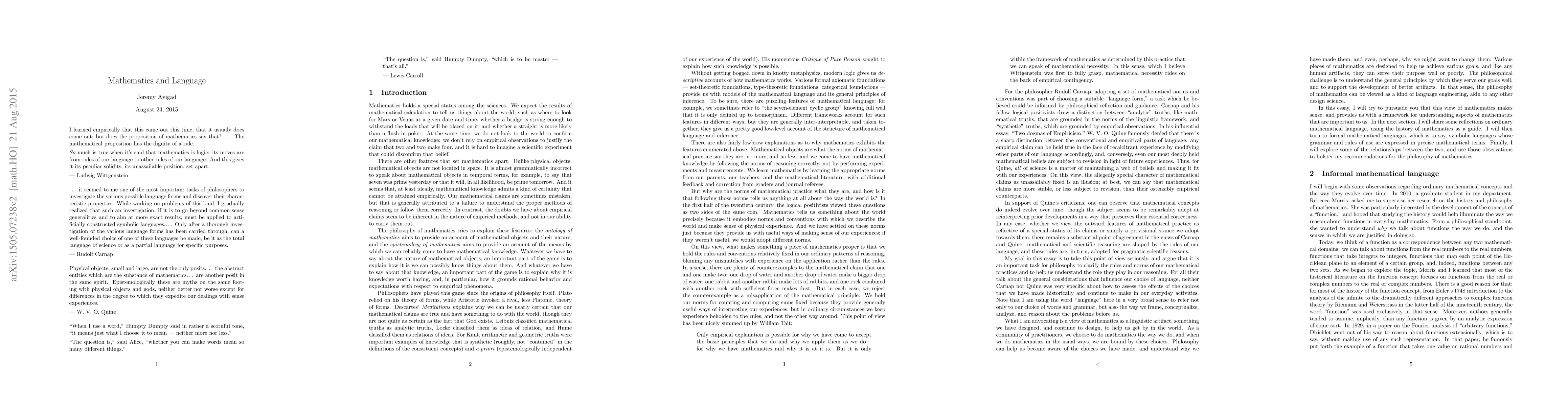 This essay considers the special character of mathematical reasoning, and draws on observations from interactive theorem proving and the history of mathematics to clarify the nature of formal and informal mathematical language. It proposes that we view mathematics as a system of conventions and norms that is designed to help us make sense of the world and reason efficiently. Like any designed system, it can perform well or poorly, and the philosophy of mathematics has a role to play in helping us understand the general principles by which it serves its purposes well.