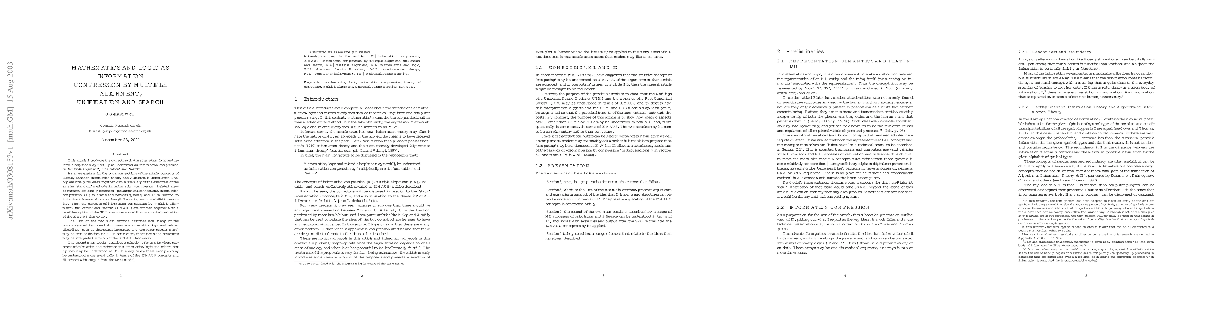 A research paper proposes that mathematics, logic, and related disciplines can be understood as information compression methods through alignment, unification, and search. It explores various examples where mathematical processes can be seen as forms of ICMAUS, a framework for understanding information compression.