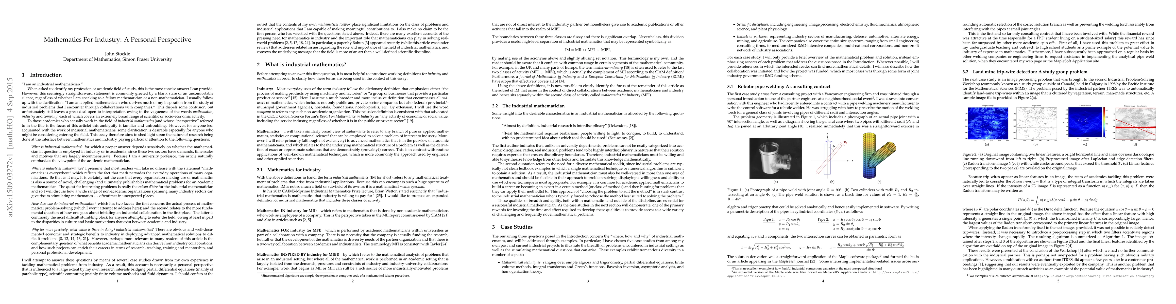 "I am an industrial mathematician." When asked to identify my profession or academic field of study, this is the most concise answer I can provide. However, this seemingly straightforward statement is commonly greeted by a blank stare or an uncomfortable silence, regardless of whether I am speaking to a fellow mathematician or a non-mathematician. I usually follow up with the clarification: "I am an applied mathematician who derives much of my inspiration from the study of industrial problems that I encounter through collaborations with companies." This dispels some confusion, but unfortunately still leaves a great deal open to interpretation owing to the vagueness of the words mathematics, industry and company, each of which covers an extremely broad range of scientific or socio-economic activity. To those academics who actually work in the field of industrial mathematics (and whose "perspective" referred to in the title is the focus of this article) this ambiguity is familiar and untroubling. However, for anyone less acquainted with the work of industrial mathematicians, some clarification is desirable especially for anyone who might be considering entering the field. This essay therefore aims to shed light upon the nature of research being done at the interface between mathematics and industry, paying particular attention to the following questions: What is industrial mathematics? Where is industrial mathematics? How does one do industrial mathematics? Why (or more precisely, what value is there in doing) industrial mathematics? I will attempt to answer these questions by means of several case studies drawn from my own experience in tackling mathematical problems from industry.
