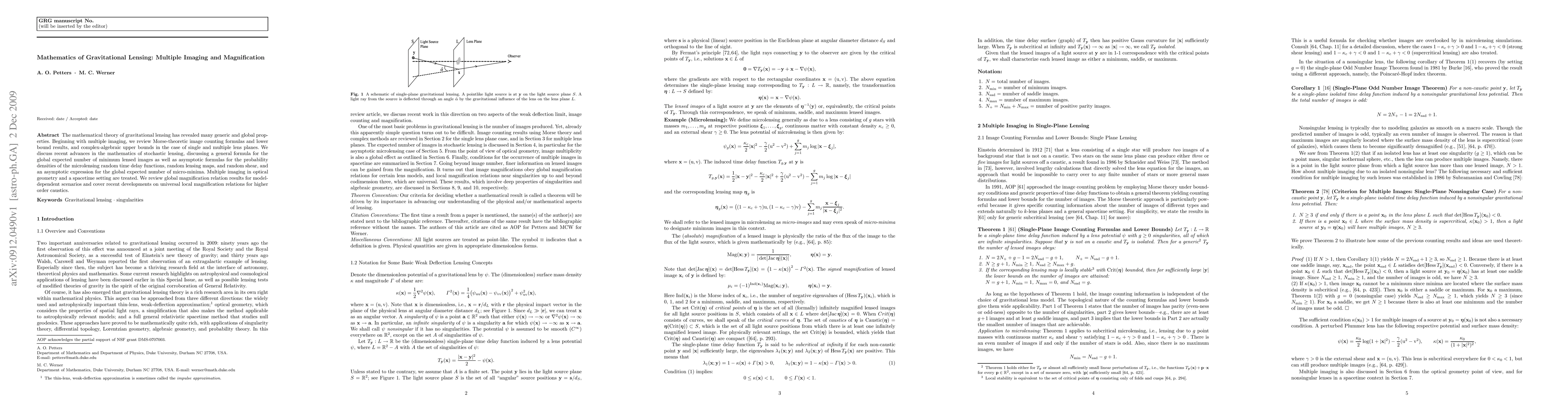 The mathematical theory of gravitational lensing has revealed many generic and global properties. Beginning with multiple imaging, we review Morse-theoretic image counting formulas and lower bound results, and complex-algebraic upper bounds in the case of single and multiple lens planes. We discuss recent advances in the mathematics of stochastic lensing, discussing a general formula for the global expected number of minimum lensed images as well as asymptotic formulas for the probability densities of the microlensing random time delay functions, random lensing maps, and random shear, and an asymptotic expression for the global expected number of micro-minima. Multiple imaging in optical geometry and a spacetime setting are treated. We review global magnification relation results for model-dependent scenarios and cover recent developments on universal local magnification relations for higher order caustics.
