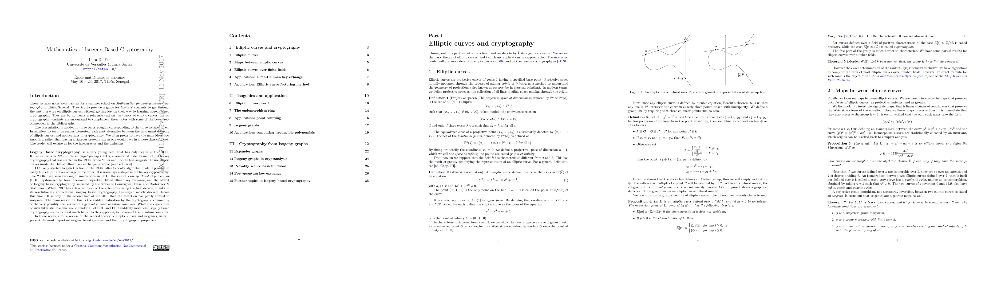 These lectures notes were written for a summer school on Mathematics for post-quantum cryptography in Thi\`es, Senegal. They try to provide a guide for Masters' students to get through the vast literature on elliptic curves, without getting lost on their way to learning isogeny based cryptography. They are by no means a reference text on the theory of elliptic curves, nor on cryptography; students are encouraged to complement these notes with some of the books recommended in the bibliography. The presentation is divided in three parts, roughly corresponding to the three lectures given. In an effort to keep the reader interested, each part alternates between the fundamental theory of elliptic curves, and applications in cryptography. We often prefer to have the main ideas flow smoothly, rather than having a rigorous presentation as one would have in a more classical book. The reader will excuse us for the inaccuracies and the omissions.
