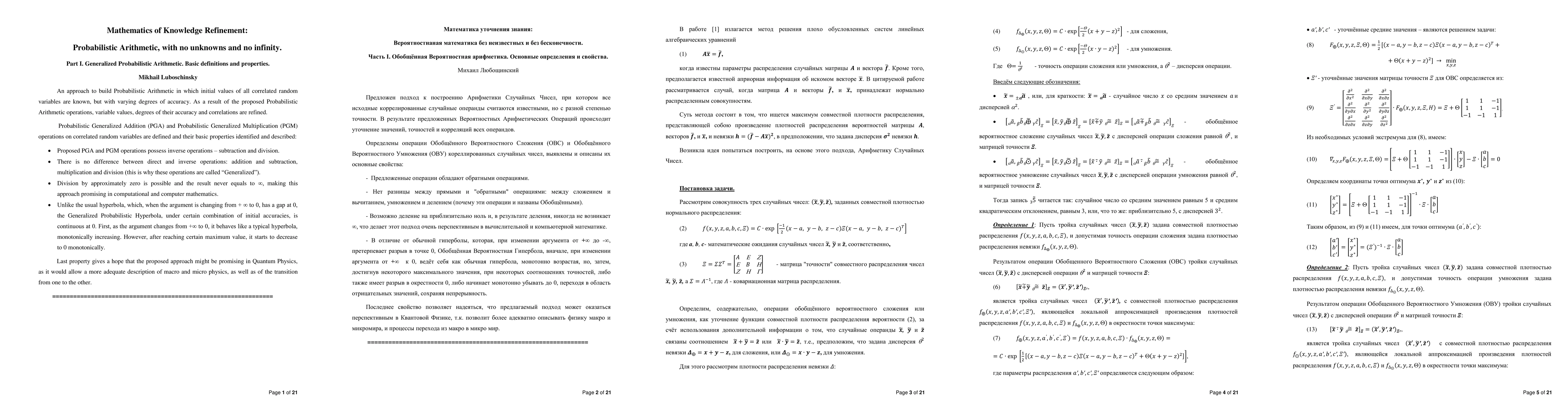 An approach to build Probabilistic Arithmetic in which initial values of all correlated random variables are known, but with varying degrees of accuracy. As a result of the proposed Probabilistic Arithmetic operations, variable values, degrees of their accuracy and correlations are refined. Probabilistic Generalized Addition (PGA) and Probabilistic Generalized Multiplication (PGM) operations on correlated random variables are defined and their basic properties identified and described: \bullet Proposed PGA and PGM operations possess inverse operations - subtraction and division. \bullet There is no difference between direct and inverse operations: addition and subtraction, multiplication and division (this is why these operations are called "Generalized"). \bullet Division by approximately zero is possible and the result never equals to \infty, making this approach promising in computational and computer mathematics. \bullet Unlike the usual hyperbola, which, when the argument is changing from + \infty to 0, has a gap at 0, the Generalized Probabilistic Hyperbola, under certain combination of initial accuracies, is continuous at 0. First, as the argument changes from +\infty to 0, it behaves like a typical hyperbola, monotonically increasing. However, after reaching certain maximum value, it starts to decrease to 0 monotonically. Last property gives a hope that the proposed approach might be promising in Quantum Physics, as it would allow a more adequate description of macro and micro physics, as well as of the transition from one to the other.
