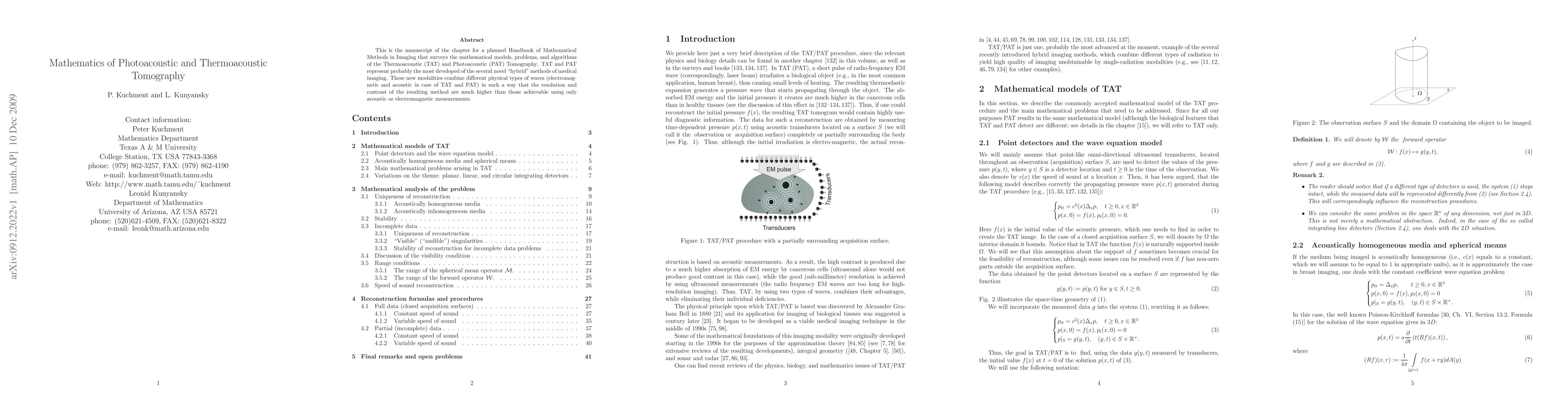 This is the manuscript of the chapter for a planned Handbook of Mathematical Methods in Imaging that surveys the mathematical models, problems, and algorithms of the Thermoacoustic (TAT) and Photoacoustic (PAT) Tomography. TAT and PAT represent probably the most developed of the several novel ``hybrid'' methods of medical imaging. These new modalities combine different physical types of waves (electromagnetic and acoustic in case of TAT and PAT) in such a way that the resolution and contrast of the resulting method are much higher than those achievable using only acoustic or electromagnetic measurements.