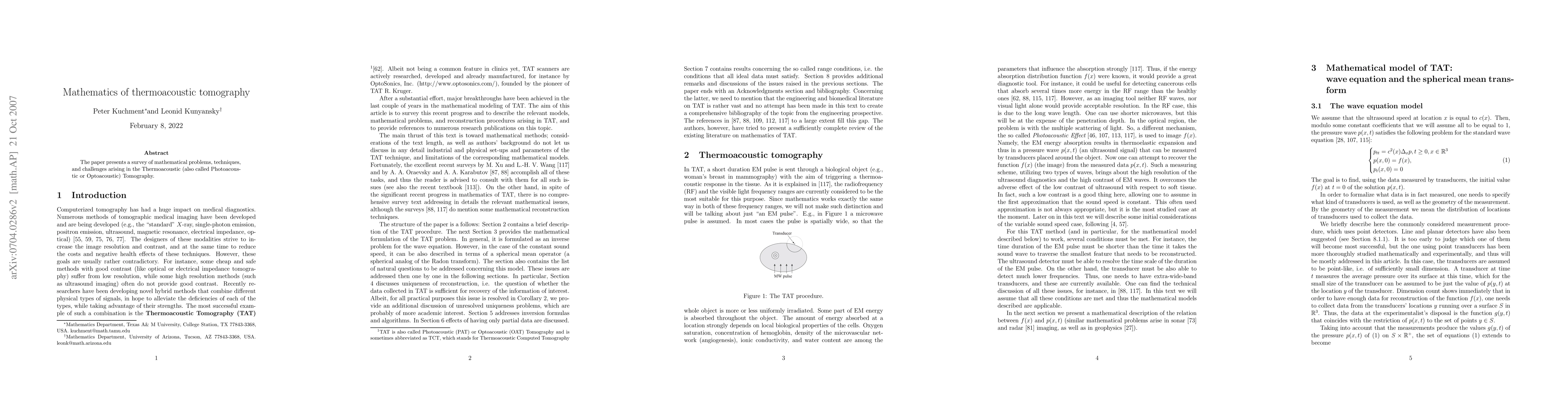 The paper presents a survey of mathematical problems, techniques, and challenges arising in the Thermoacoustic and Photoacoustic Tomography.