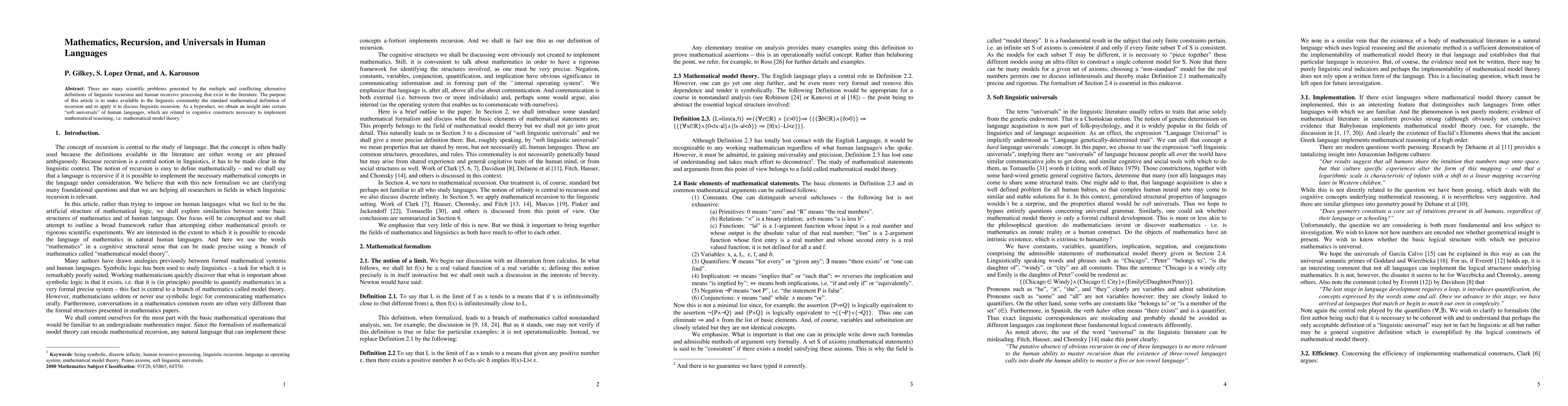 This paper provides a mathematical definition of recursion and applies it to human languages, revealing common cognitive constructs necessary for mathematical reasoning. It aims to clarify linguistic recursion and provide insights into universal aspects of human language processing.