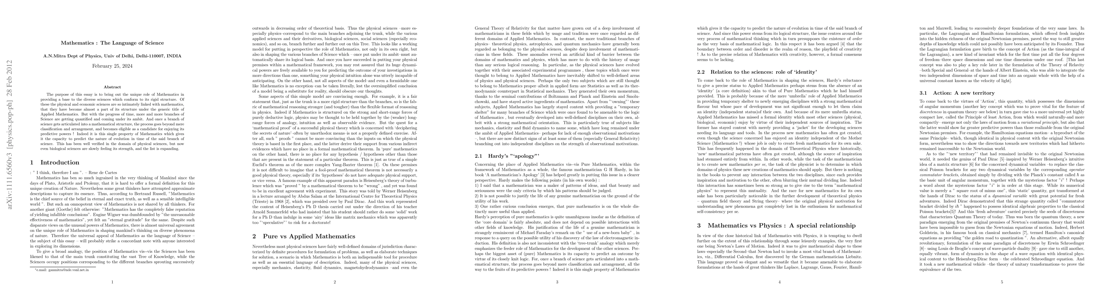 This essay explores Mathematics' foundational role in diverse sciences, highlighting its increasing influence in quantifying and predicting various branches, particularly physical and economic sciences, and now extending to biological sciences. The essay underscores Mathematics' unique capacity for predictive power in scientific evolution.
