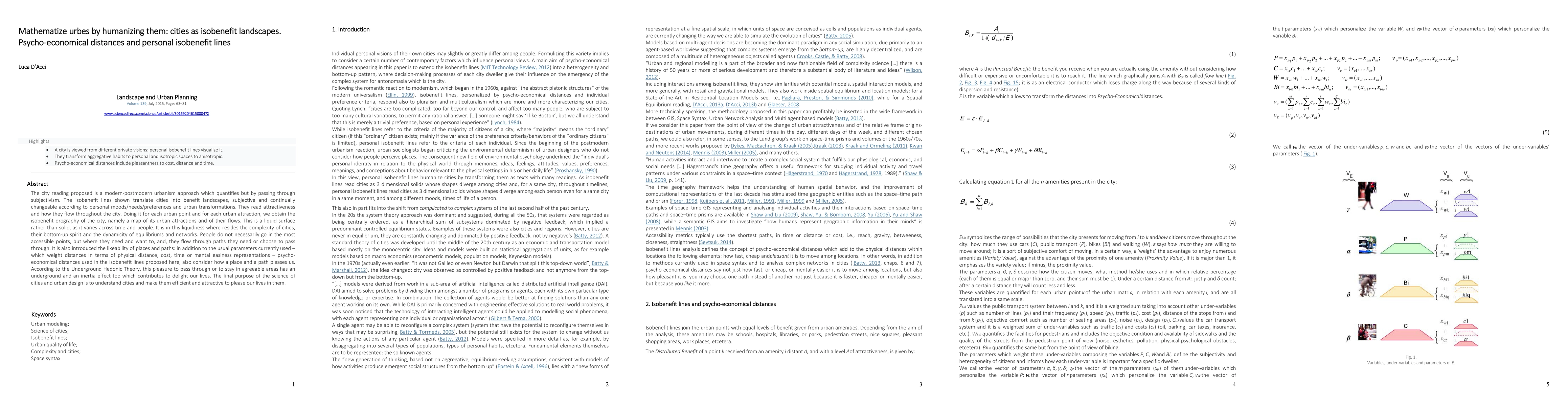 The city reading proposed is a modern postmodern urbanism approach which quantifies but by passing through subjectivism. The isobenefit lines shown translate cities into benefit landscapes, subjective and continually changeable according to personal moods needs preferences and urban transformations. They read attractiveness and how they flow throughout the city. Doing it for each urban point and for each urban attraction, we obtain the isobenefit orography of the city, namely a map of its urban attractions and of their flows. This is a liquid surface rather than solid, as it varies across time and people. It is in this liquidness where resides the complexity of cities, their bottom up spirit and the dynamicity of equilibriums and networks. People do not necessarily go in the most accessible points, but where they need and want to, and, they flow through paths they need or choose to pass through. It is also introduced the likeability of places and paths: in addition to the usual parameters currently used, which weight distances in terms of physical distance, cost, time or mental easiness representations, psycho-economical distances used in the isobenefit lines proposed here, also consider how a place and a path pleases us. According to the Underground Hedonic Theory, this pleasure to pass through or to stay in agreeable areas has an underground and an inertia effect too which contributes to delight our lives. The final purpose of the science of cities and urban design is to understand cities and make them efficient and attractive to please our lives in them.