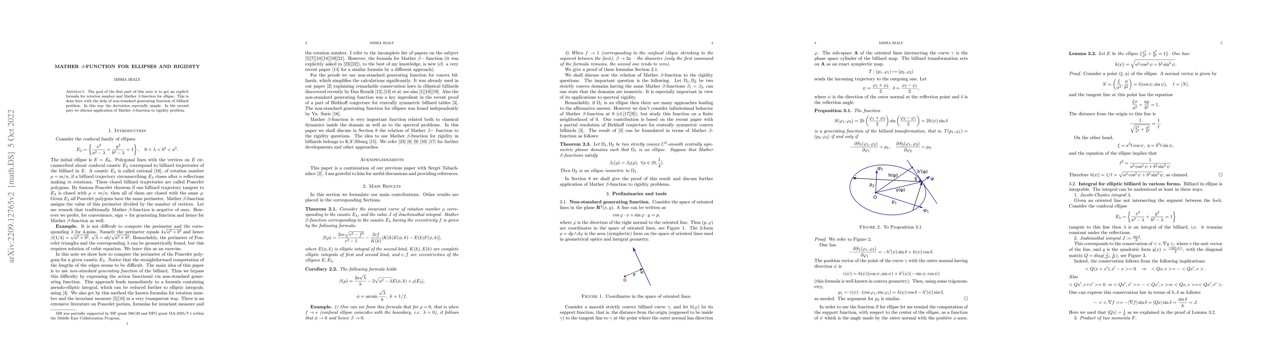 This paper derives an explicit formula for the rotation number and Mather $\beta$-function for ellipses using a non-standard generating function for the billiard problem. It then applies the Mather $\beta$-function to address rigidity problems.