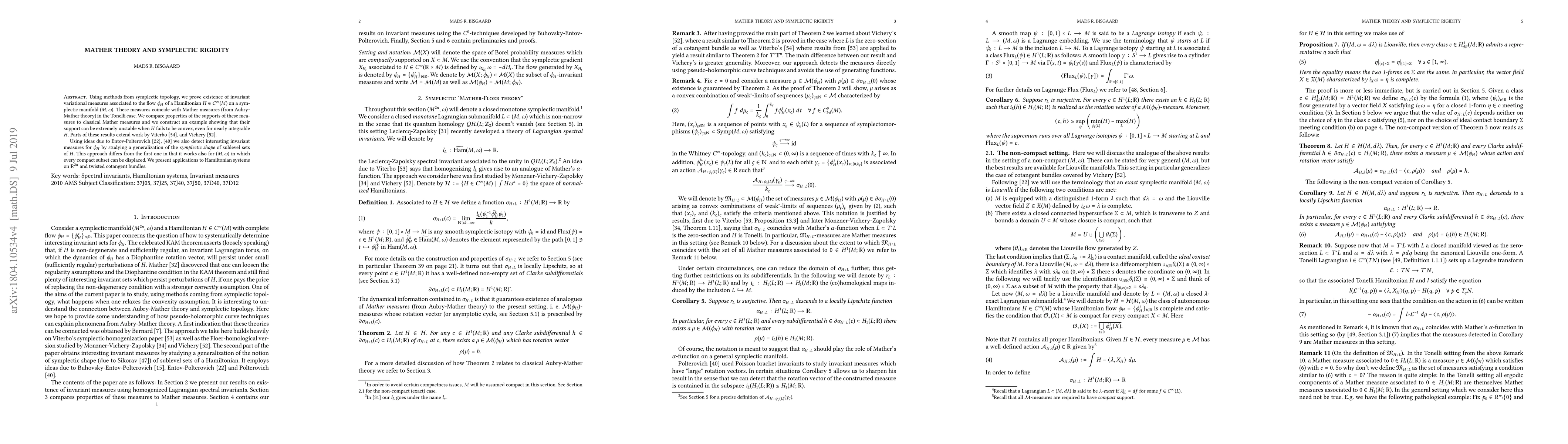 Using methods from symplectic topology, we prove existence of invariant variational measures associated to the flow $\phi_H$ of a Hamiltonian $H\in C^{\infty}(M)$ on a symplectic manifold $(M,\omega)$. These measures coincide with Mather measures (from Aubry-Mather theory) in the Tonelli case. We compare properties of the supports of these measures to classical Mather measures and we construct an example showing that their support can be extremely unstable when $H$ fails to be convex, even for nearly integrable $H$. Parts of these results extend work by Viterbo and Vichery. Using ideas due to Entov-Polterovich we also detect interesting invariant measures for $\phi_H$ by studying a generalization of the symplectic shape of sublevel sets of $H$. This approach differs from the first one in that it works also for $(M,\omega)$ in which every compact subset can be displaced. We present applications to Hamiltonian systems on $\mathbb{R}^{2n}$ and twisted cotangent bundles.