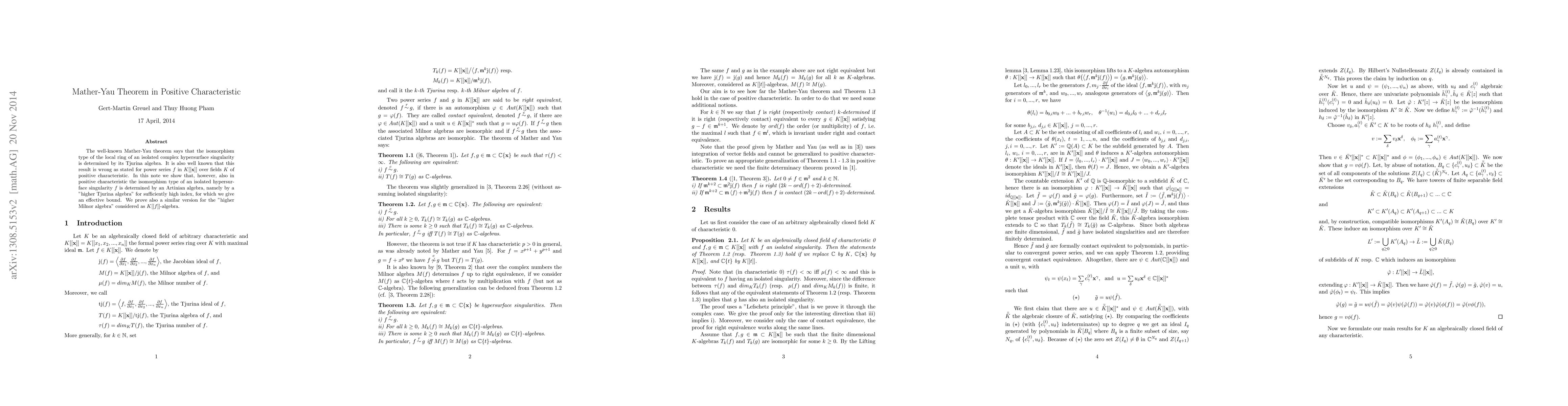 The well-known Mather-Yau theorem says that the isomorphism type of the local ring of an isolated complex hypersurface singularity is determined by its Tjurina algebra. It is also well known that this result is wrong as stated for power series f in K[[x]] over fields K of positive characteristic. In this note we show that, however, also in positive characteristic the isomorphism type of an isolated hypersurface singularity f is determined by an Artinian algebra, namely by a "higher Tjurina algebra" for sufficiently high index, for which we give an effective bound. We prove also a similar version for the "higher Milnor algebra" considered as K[[f]]-algebra.