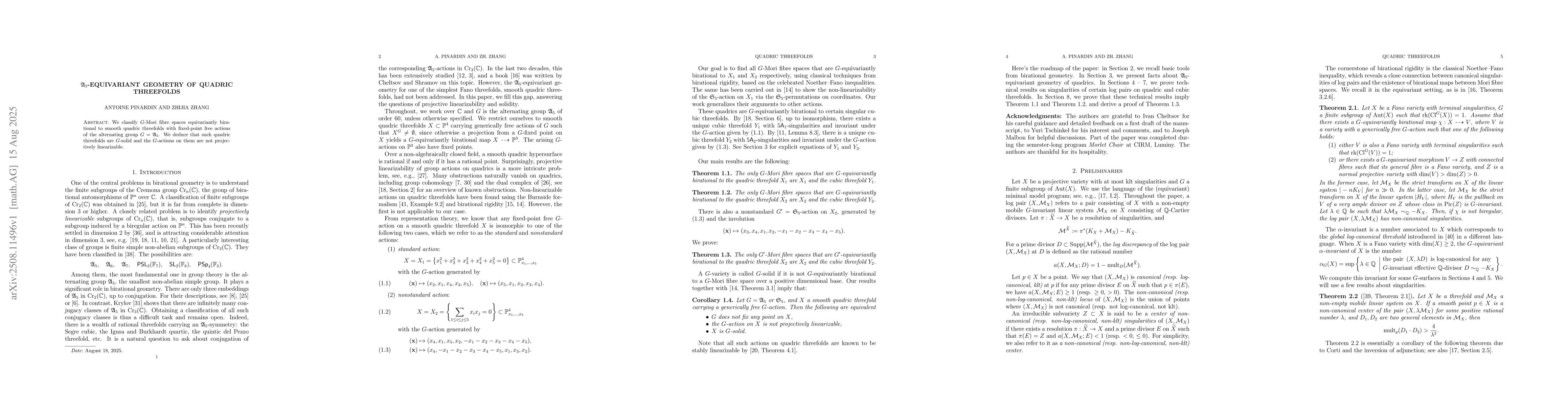 We classify $G$-Mori fibre spaces equivariantly birational to smooth quadric threefolds with fixed-point free actions of the alternating group $G=\mathfrak A_5$. We deduce that such quadric threefolds are $G$-solid and the $G$-actions on them are not projectively linearizable.
