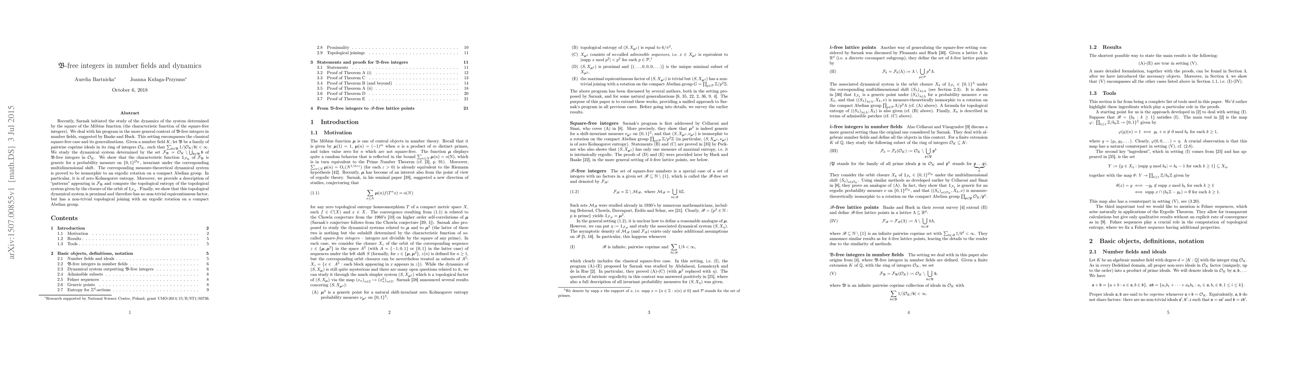 Recently, Sarnak initiated the study of the dynamics of the system determined by the square of the M\"obius function (the characteristic function of the square-free integers). We deal with his program in the more general context of $\mathfrak{B}$-free integers in number fields, suggested by Baake and Huck. This setting encompasses the classical square-free case and its generalizations. Given a~number field $K$, let $\mathfrak{B}$ be a~family of pairwise coprime ideals in its ring of integers $\mathcal{O}_K$, such that $\sum_{\mathfrak{b} \in \mathfrak{B}} 1/|\mathcal{O}_K / \mathfrak{b}| < \infty$. We study the dynamical system determined by the set $\mathcal{F}_\mathfrak{B} = \mathcal{O}_K \setminus \bigcup_{\mathfrak{b} \in \mathfrak{B}}\mathfrak{b}$ of $\mathfrak{B}$-free integers in $\mathcal{O}_K$. We show that the characteristic function $\mathbb{1}_{\mathcal{F}_\mathfrak{B}}$ of $\mathcal{F}_\mathfrak{B}$ is generic for a~probability measure on $\{0,1\}^{\mathcal{O}_K}$, invariant under the corresponding multidimensional shift. The corresponding measure-theoretical dynamical system is proved to be isomorphic to an ergodic rotation on a~compact Abelian group. In particular, it is of zero Kolmogorov entropy. Moreover, we provide a~description of "patterns" appearing in $\mathcal{F}_\mathfrak{B}$ and compute the topological entropy of the topological system given by the closure of the orbit of $\mathbb{1}_{\mathcal{F}_\mathfrak{B}}$. Finally, we show that this topological dynamical system is proximal and therefore has no non-trivial equicontinuous factor, but has a~non-trivial topological joining with an ergodic rotation on a~compact Abelian group.