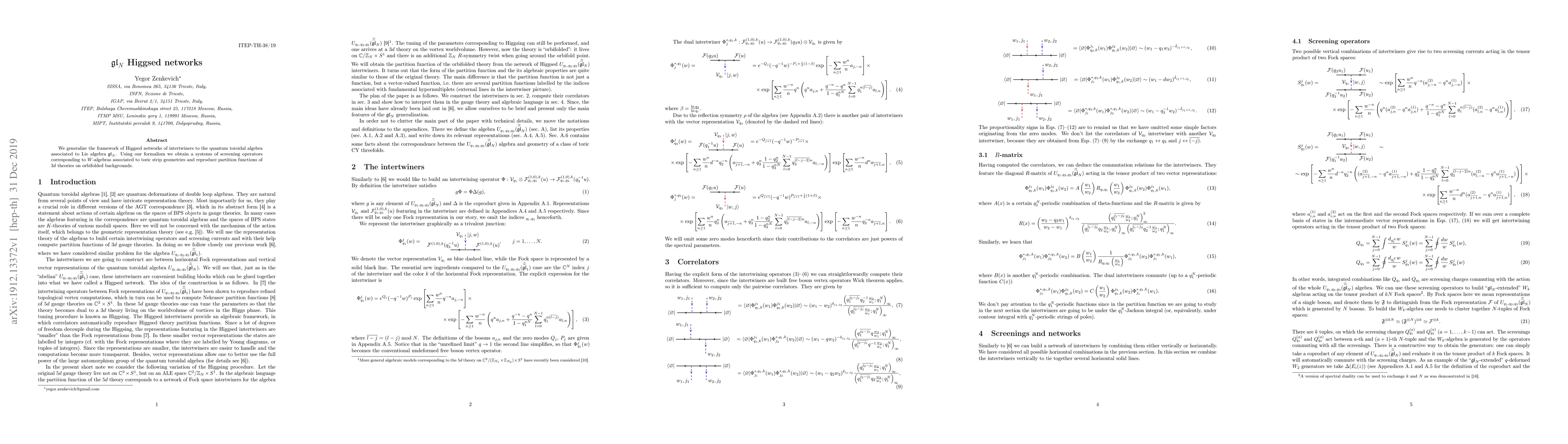The paper generalizes Higgsed networks of intertwiners to $\mathfrak{gl}_N$ quantum toroidal algebras, deriving screening operators linked to W-algebras and computing partition functions for 3d theories on orbifolded backgrounds.