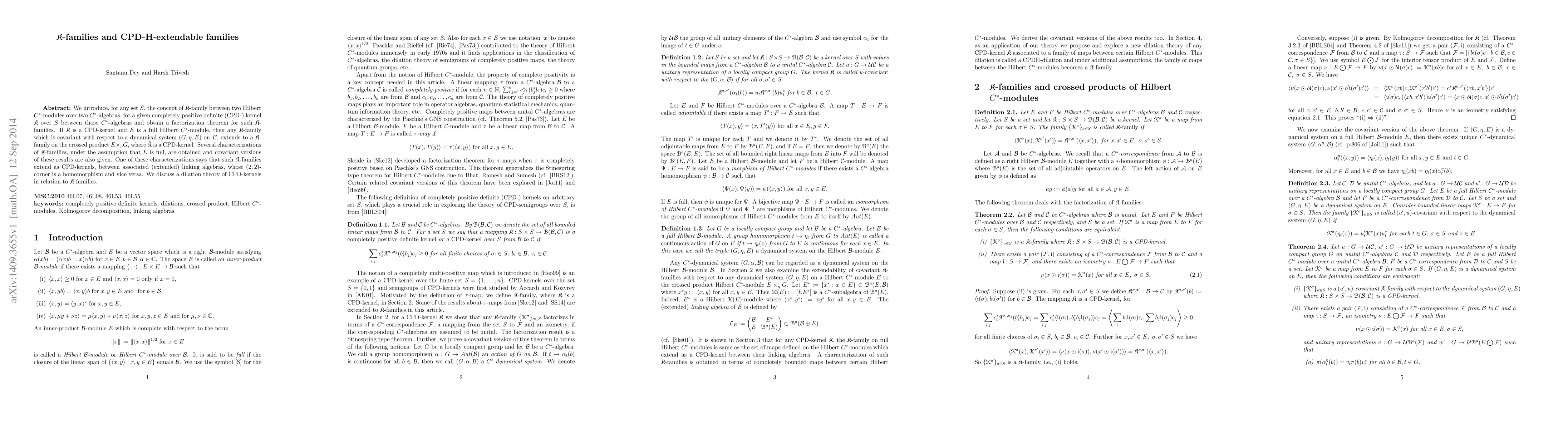We introduce, for any set $S$, the concept of $\mathfrak{K}$-family between two Hilbert $C^*$-modules over two $C^*$-algebras, for a given completely positive definite (CPD-) kernel $\mathfrak{K}$ over $S$ between those $C^*$-algebras and obtain a factorization theorem for such $\mathfrak{K}$-families. If $\mathfrak{K}$ is a CPD-kernel and $E$ is a full Hilbert $C^*$-module, then any $\mathfrak{K}$-family which is covariant with respect to a dynamical system $(G,\eta,E)$ on $E$, extends to a $\tilde{\mathfrak{K}}$-family on the crossed product $E \times_\eta G$, where $\tilde{\mathfrak{K}}$ is a CPD-kernel. Several characterizations of $\mathfrak{K}$-families, under the assumption that ${E}$ is full, are obtained and covariant versions of these results are also given. One of these characterizations says that such $\mathfrak{K}$-families extend as CPD-kernels, between associated (extended) linking algebras, whose $(2,2)$-corner is a homomorphism and vice versa. We discuss a dilation theory of CPD-kernels in relation to $\mathfrak{K}$-families.