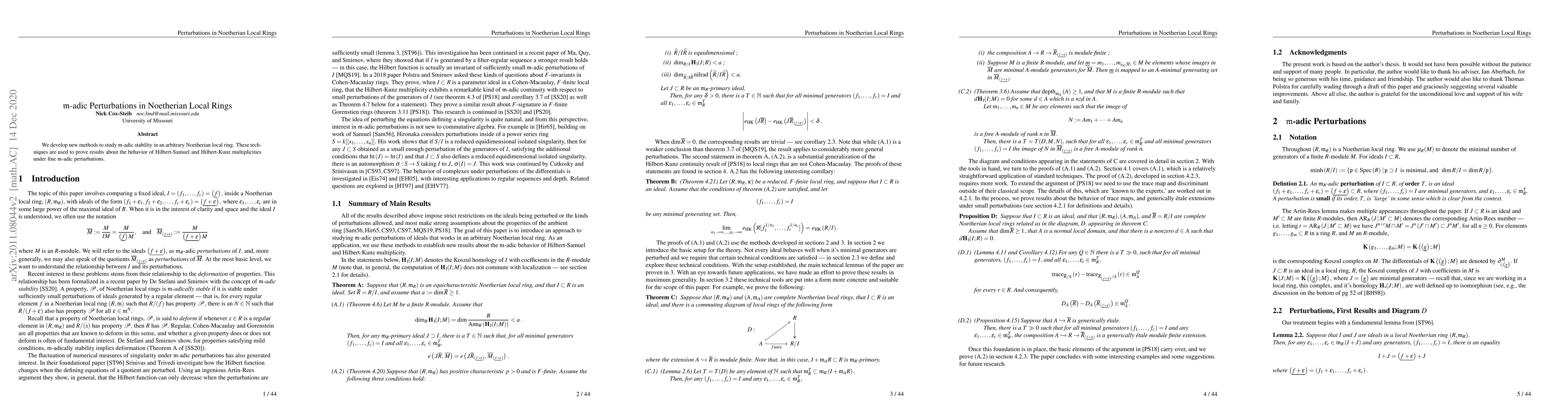 This paper develops new methods to study stability in Noetherian local rings under fine $rak{m}$-adic perturbations, focusing on Hilbert-Samuel and Hilbert-Kunz multiplicities.