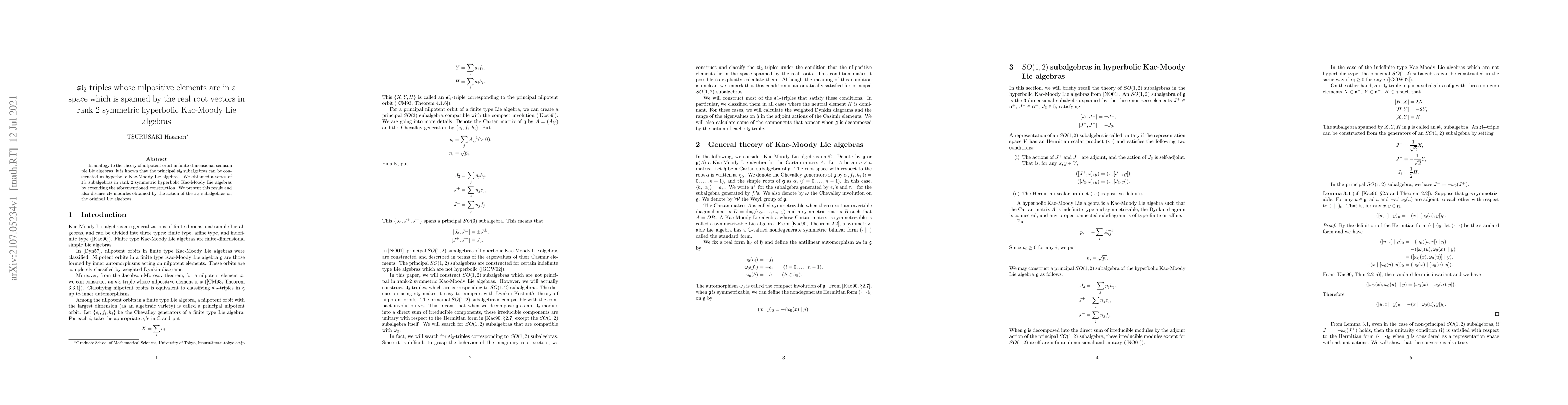 This paper constructs $\mathfrak{sl}_2$ subalgebras in rank 2 symmetric hyperbolic Kac-Moody Lie algebras and explores the resulting $\mathfrak{sl}_2$ modules, extending the theory of nilpotent orbits from finite-dimensional semisimple Lie algebras.