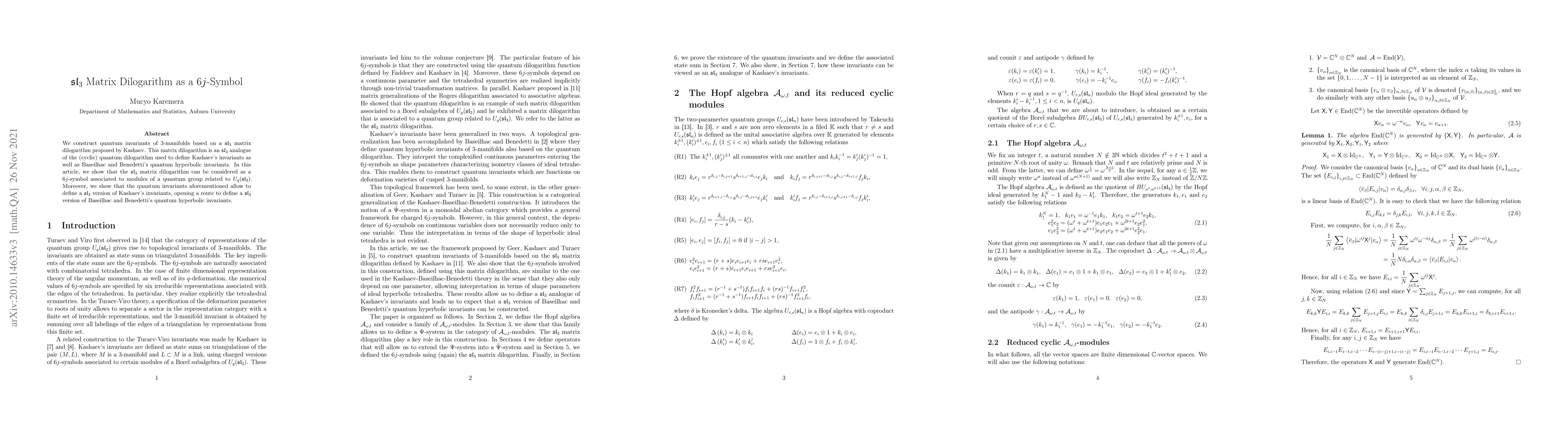 The paper introduces a novel approach to quantum invariants using $\mathfrak{sl}_3$ matrix dilogarithms and their interpretation as 6j-symbols, extending the framework of quantum topological invariants.