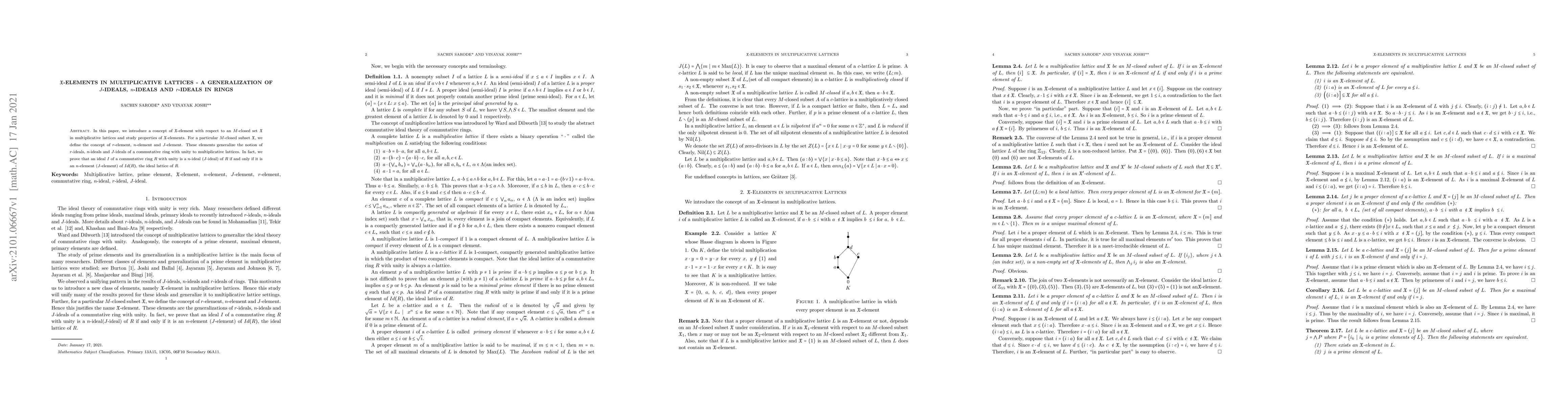 The paper presents a novel approach to generalize $r$-ideals, $n$-ideals, and $J$-ideals by defining $\mathfrak{X}$-elements in multiplicative lattices, along with associated lemmas and theorems.