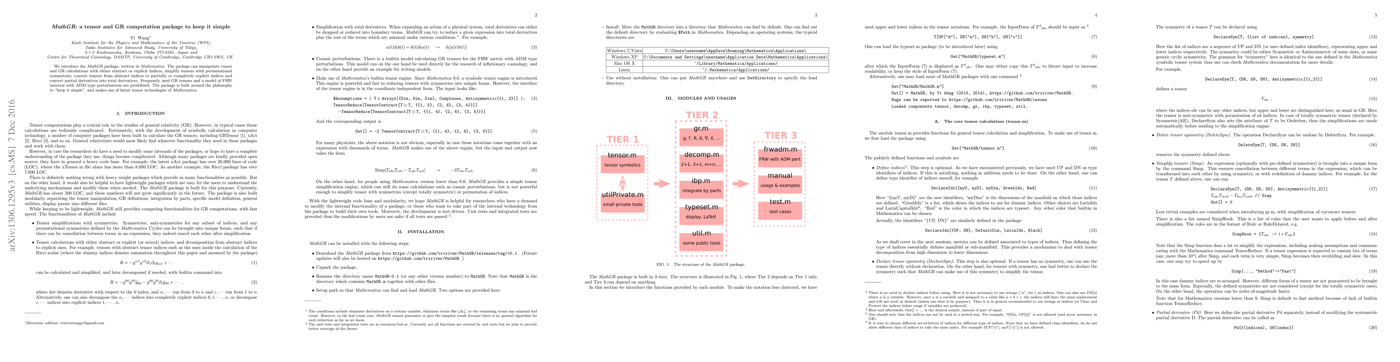 We introduce the MathGR package, written in Mathematica. The package can manipulate tensor and GR calculations with either abstract or explicit indices, simplify tensors with permutational symmetries, decompose tensors from abstract indices to partially or completely explicit indices and convert partial derivatives into total derivatives. Frequently used GR tensors and a model of FRW universe with ADM type perturbations are predefined. The package is built around the philosophy to "keep it simple", and makes use of latest tensor technologies of Mathematica.