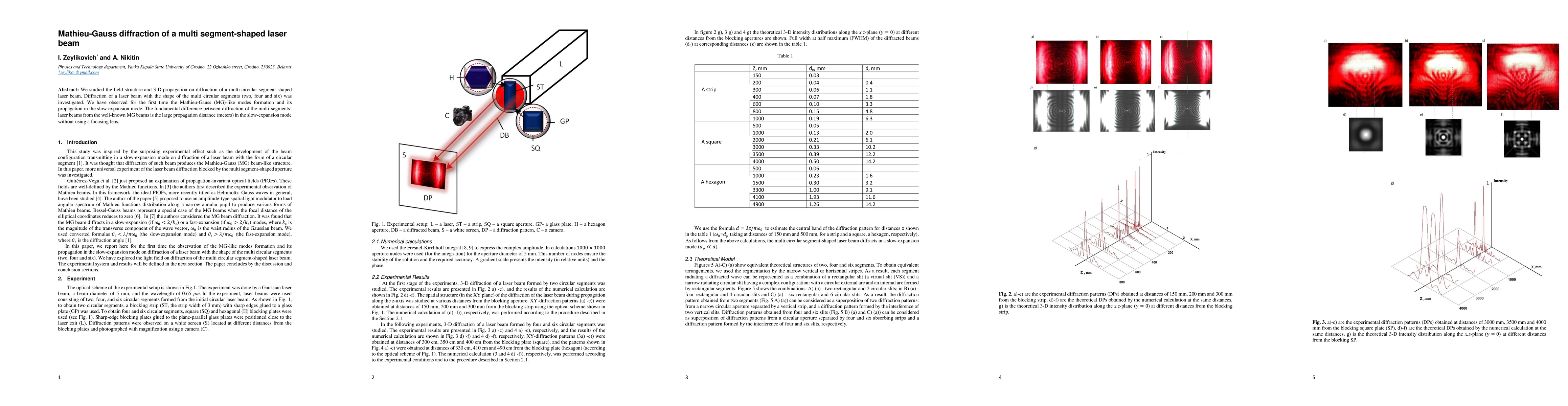 The paper presents a detailed mathematical model and experimental validation of the diffraction of multi-segment shaped laser beams, utilizing the 3-D Helmholtz equation and elliptical-cylindrical coordinates to describe the field structure.