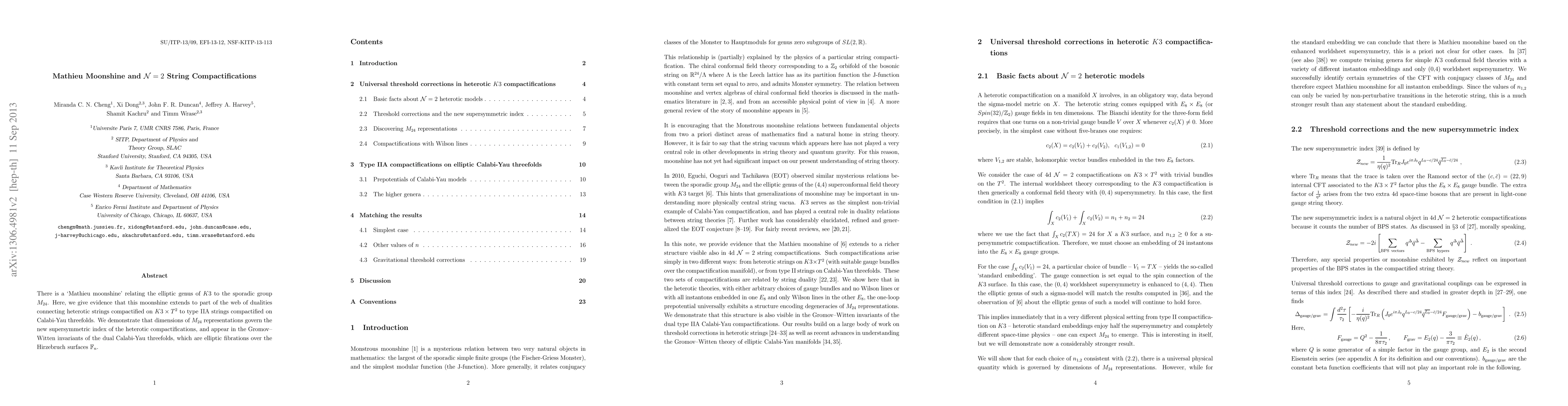 The paper explores the connection between Mathieu moonshine and N=2 string theory compactifications, demonstrating that dimensions of M_{24} representations determine the supersymmetric index in heterotic string compactifications on K3 x T^2 and appear in Gromov-Witten invariants of dual Calabi-Yau threefolds.