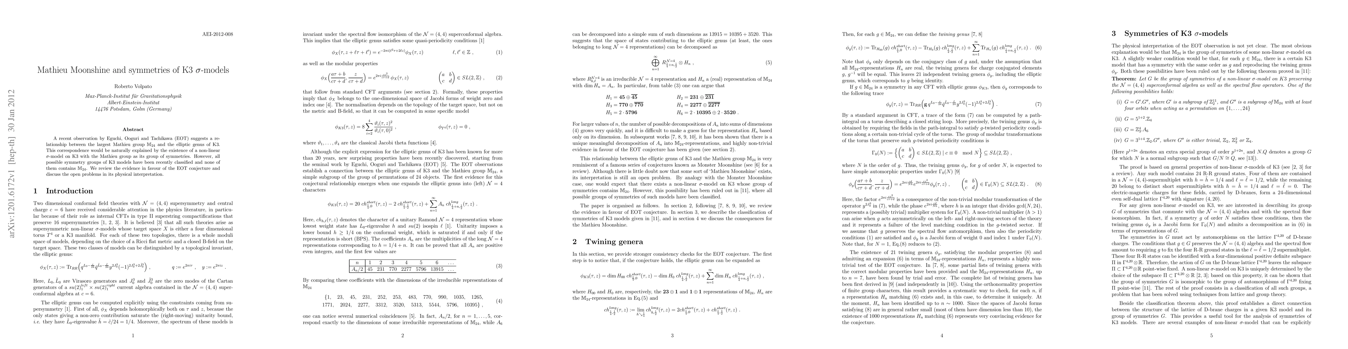A recent observation by Eguchi, Ooguri and Tachikawa (EOT) suggests a relationship between the largest Mathieu group M24 and the elliptic genus of K3. This correspondence would be naturally explained by the existence of a non-linear sigma-model on K3 with the Mathieu group as its group of symmetries. However, all possible symmetry groups of K3 models have been recently classified and none of them contains M24. We review the evidence in favour of the EOT conjecture and discuss the open problems in its physical interpretation.