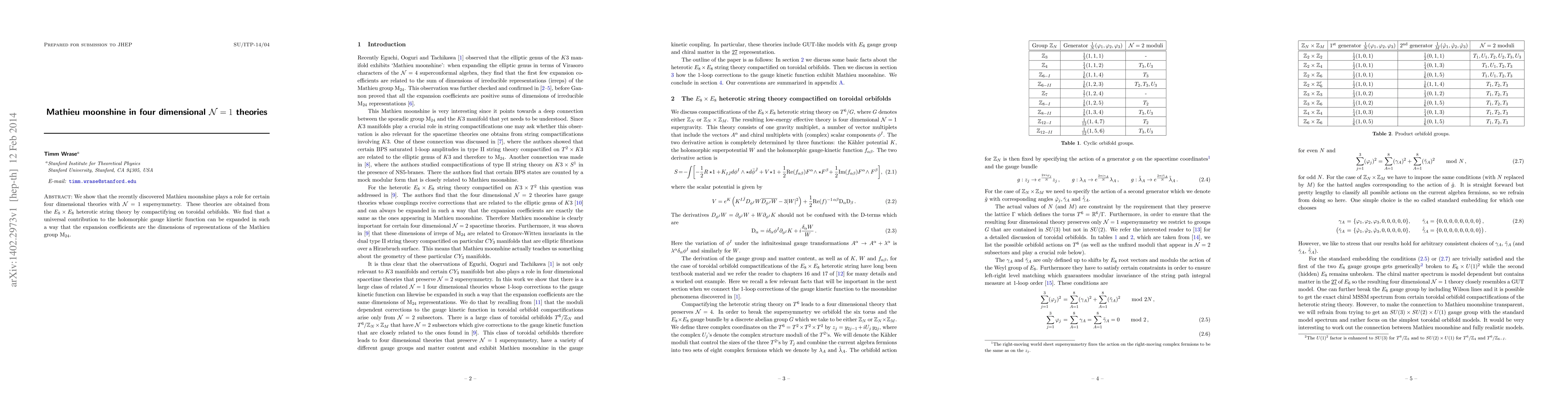 Summary: The research demonstrates that Mathieu moonshine influences four-dimensional $\mathcal{N}=1$ supersymmetric theories derived from $E_8 \times E_8$ heterotic string theory, revealing a connection between the expansion coefficients of the holomorphic gauge kinetic function and the dimensions of representations of the Mathieu group M$_{24}$.