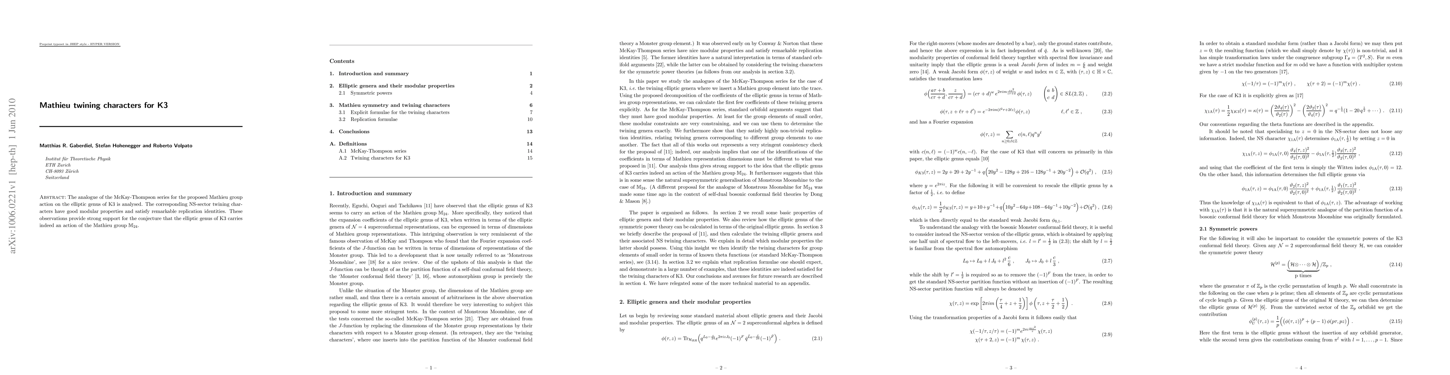 The analogue of the McKay-Thompson series for the proposed Mathieu group action on the elliptic genus of K3 is analysed. The corresponding NS-sector twining characters have good modular properties and satisfy remarkable replication identities. These observations provide strong support for the conjecture that the elliptic genus of K3 carries indeed an action of the Mathieu group M24.