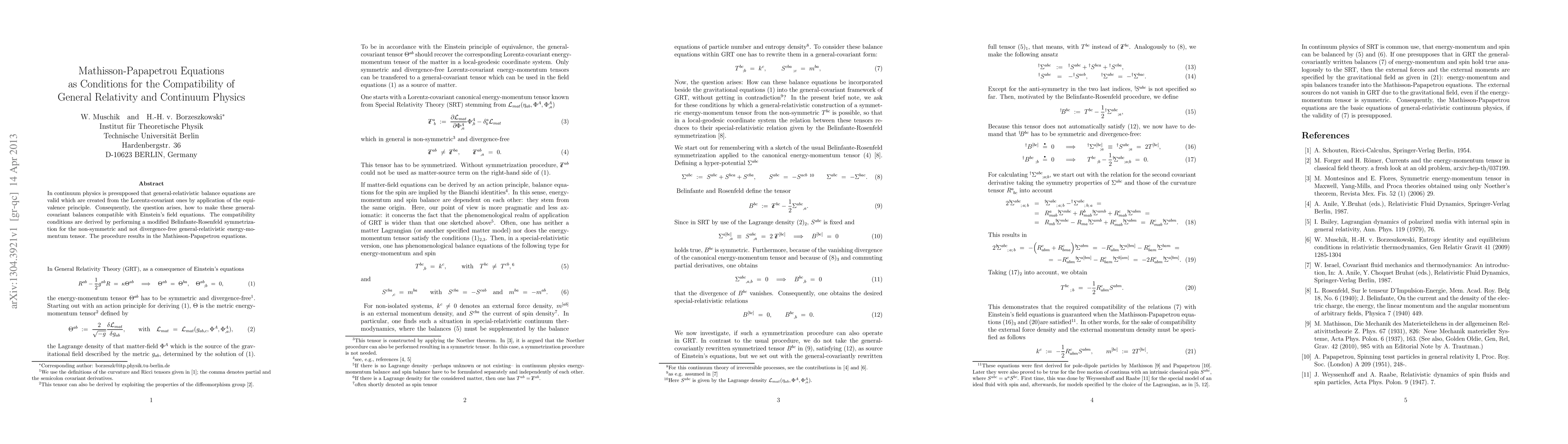 The paper derives compatibility conditions between general-relativistic continuum physics and Einstein's field equations through a modified symmetrization process, leading to the derivation of the Mathisson-Papapetrou equations. This approach ensures the consistency of general-relativistic balance equations with the field equations.