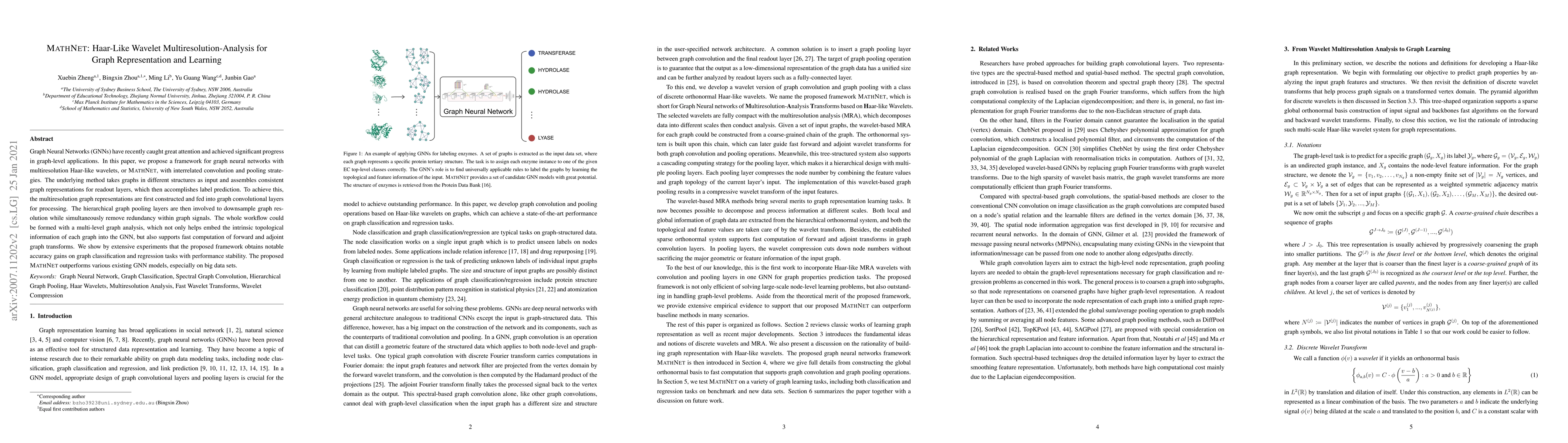 This paper introduces MathNet, a framework for Graph Neural Networks (GNNs) utilizing multiresolution Haar-like wavelets for constructing consistent graph representations. The method employs convolution and pooling strategies to embed topological information and achieve fast computation, leading to notable accuracy and stability in graph classification and regression tasks.