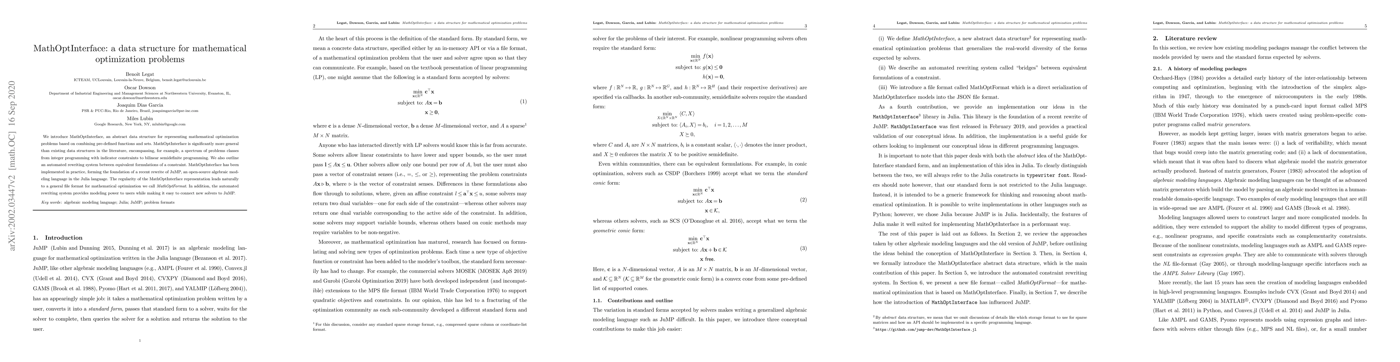 MathOptInterface is a versatile data structure for representing various mathematical optimization problems, encompassing a wide range of problem classes. It facilitates the connection of new solvers to JuMP and supports an automated rewriting system for equivalent formulations.