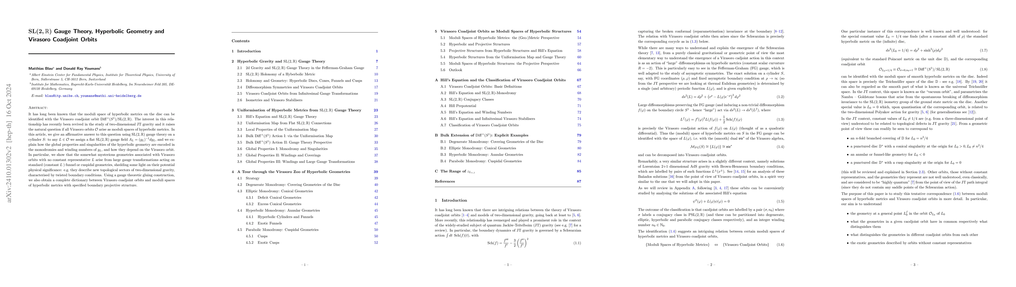 It has long been known that the moduli space of hyperbolic metrics on the disc can be identified with the Virasoro coadjoint orbit $\mathrm{Diff}^+(S^1) / \mathrm{SL}(2,\mathbb{R})$. The interest in this relationship has recently been revived in the study of two-dimensional JT gravity and it raises the natural question if all Virasoro orbits $\mathcal{O}$ arise as moduli spaces of hyperbolic metrics. In this article, we give an affirmative answer to this question using $\mathrm{SL}(2,\mathbb{R})$ gauge theory on a cylinder $S$: to any $L\in\mathcal{O}$ we assign a flat $\mathrm{SL}(2,\mathbb{R})$ gauge field $A_L = (g_L)^{-1} dg_L$, and we explain how the global properties and singularities of the hyperbolic geometry are encoded in the monodromies and winding numbers of $g_L$, and how they depend on the Virasoro orbit. In particular, we show that the somewhat mysterious geometries associated with Virasoro orbits with no constant representative $L$ arise from large gauge transformations acting on standard (constant $L$ ) funnel or cuspidal geometries, shedding some light on their potential physical significance: e.g. they describe new topological sectors of two-dimensional gravity, characterised by twisted boundary conditions. Using a gauge theoretic gluing construction, we also obtain a complete dictionary between Virasoro coadjoint orbits and moduli spaces of hyperbolic metrics with specified boundary projective structure.