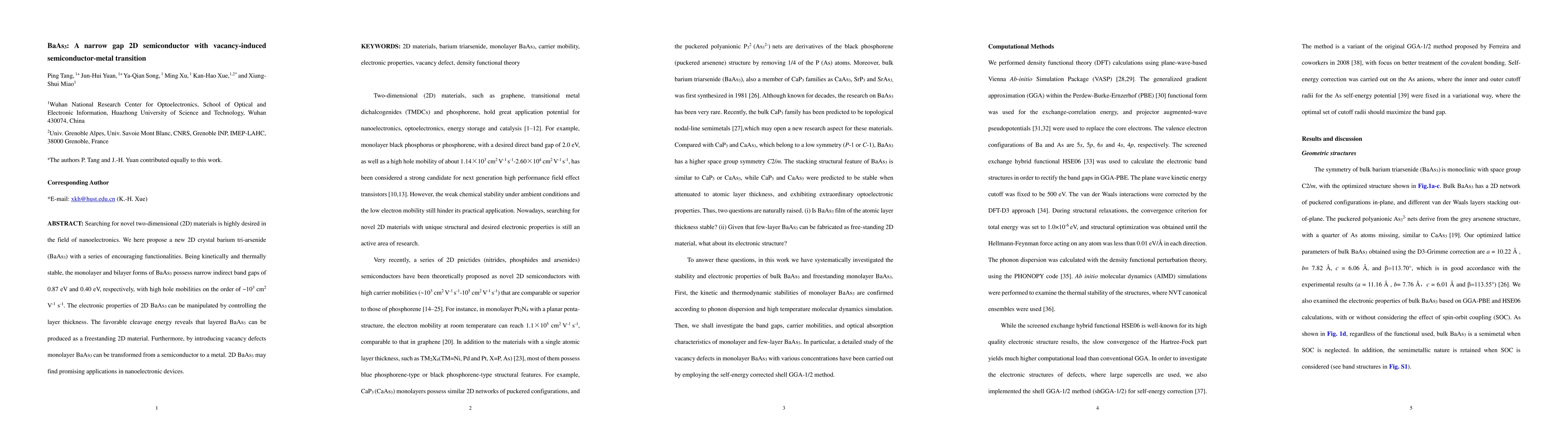 Searching for novel two-dimensional (2D) materials is highly desired in the field of nanoelectronics. We here propose a new 2D crystal barium tri-arsenide ($\mathrm{BaAs_3}$) with a series of encouraging functionalities. Being kinetically and thermally stable, the monolayer and bilayer forms of $\mathrm{BaAs_3}$ possess narrow indirect band gaps of 0.87 eV and 0.40 eV, respectively, with high hole mobilities on the order of ~$\mathrm{10^3\ cm^{2}\,V^{-1}\,s^{-1}}$. The electronic properties of 2D $\mathrm{BaAs_3}$ can be manipulated by controlling the layer thickness. The favorable cleavage energy reveals that layered $\mathrm{BaAs_3}$ can be produced as a freestanding 2D material. Furthermore, by introducing vacancy defects monolayer $\mathrm{BaAs_3}$ can be transformed from a semiconductor to a metal. 2D $\mathrm{BaAs_3}$ may find promising applications in nanoelectronic devices.