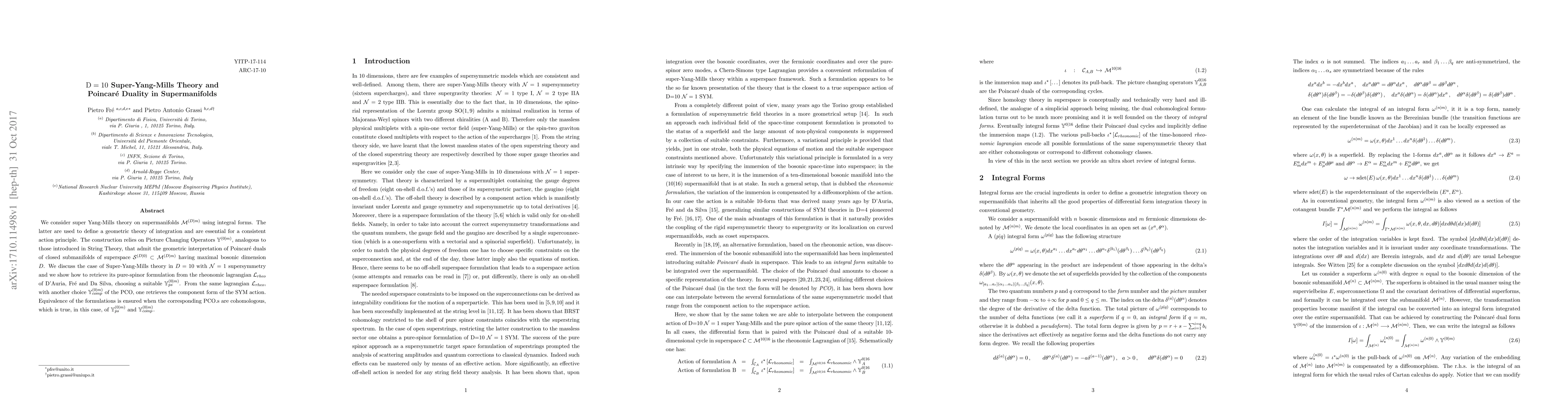 Researchers developed a new approach to Super-Yang-Mills theory on supermanifolds using integral forms and Picture Changing Operators, providing an alternative formulation for the D=10 case with N=1 supersymmetry.
