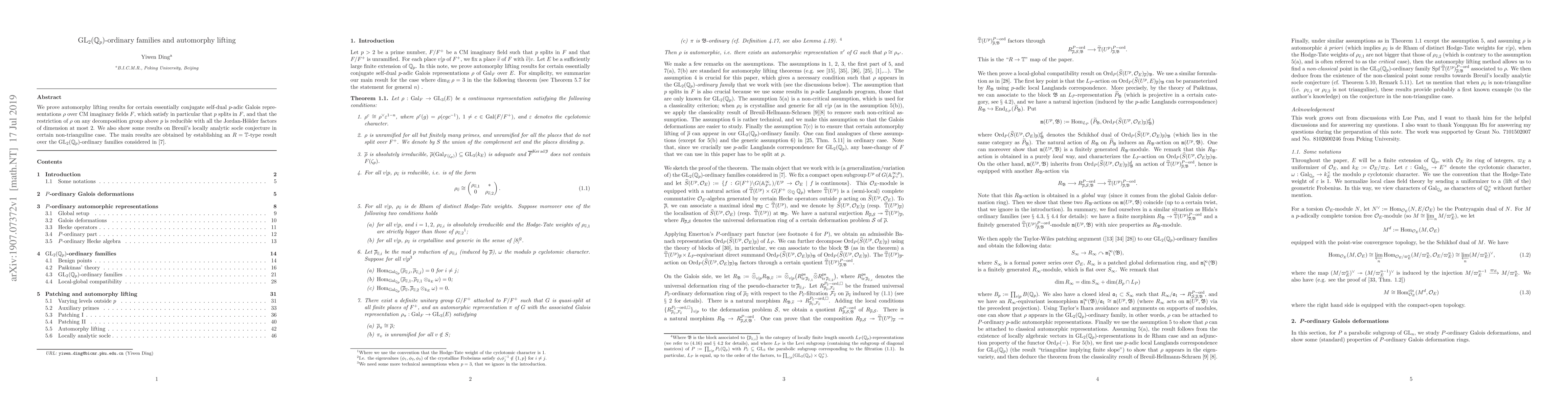 We prove automorphy lifting results for certain essentially conjugate self-dual $p$-adic Galois representations $\rho$ over CM imaginary fields $F$, which satisfy in particular that $p$ splits in $F$, and that the restriction of $\rho$ on any decomposition group above $p$ is reducible with all the Jordan-H\"older factors of dimension at most $2$. We also show some results on Breuil's locally analytic socle conjecture in certain non-trianguline case. The main results are obtained by establishing an $R=\mathbb{T}$-type result over the $\mathrm{GL}_2(\mathbb{Q}_p)$-ordinary families considered by Breuil-Ding.