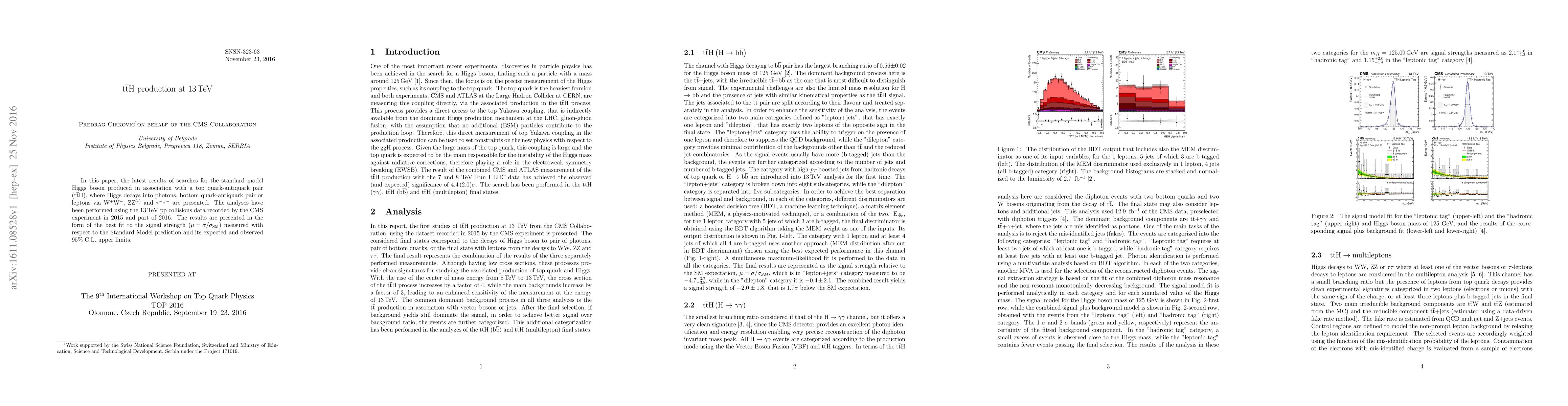 The research utilized 13 TeV pp collision data from the CMS experiment in 2015 and part of 2016, analyzing $\mathrm{t\bar{t}H}$ production with Higgs boson decays into photons, bottom quark-antiquark pairs, and leptons via $\mathrm{WW^*}$, $\mathrm{ZZ^*}$, and $\mathrm{\tau\tau}$.