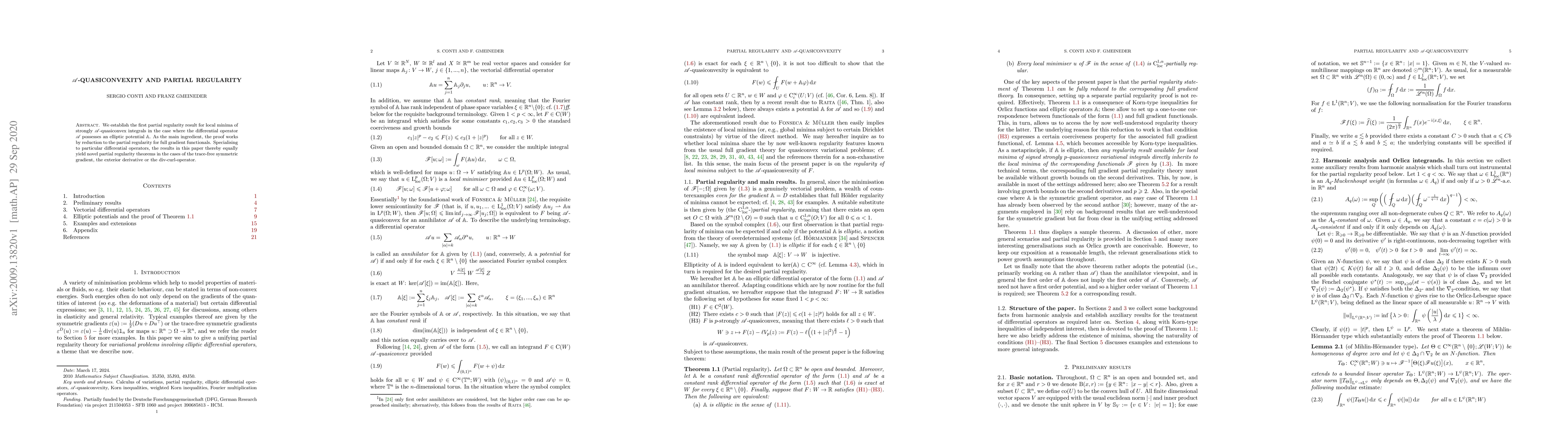 We establish the first partial regularity result for local minima of strongly $\mathscr{A}$-quasiconvex integrals in the case where the differential operator $\mathscr{A}$ possesses an elliptic potential $\mathbb{A}$. As the main ingredient, the proof works by reduction to the partial regularity for full gradient functionals. Specialising to particular differential operators, the results in this paper thereby equally yield novel partial regularity theorems in the cases of the trace-free symmetric gradient, the exterior derivative or the div-curl-operator.