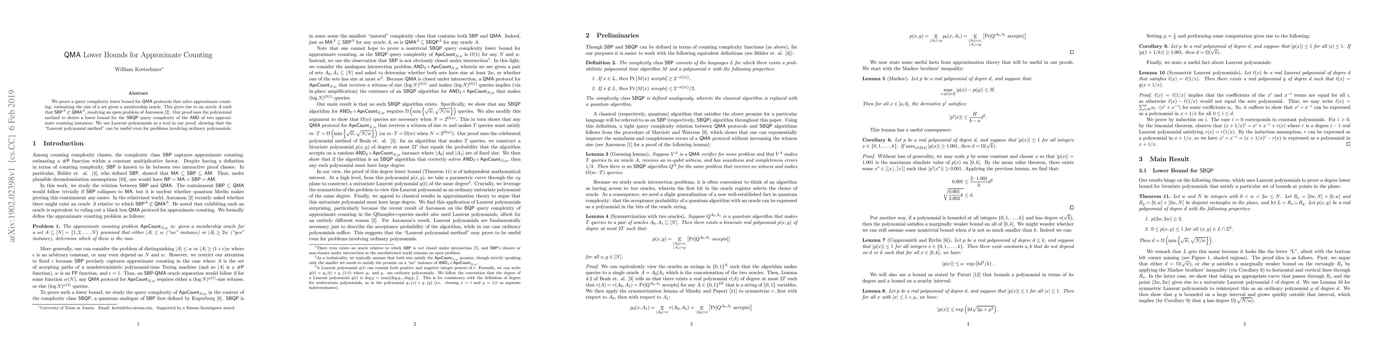 The paper establishes a query complexity lower bound for $\mathsf{QMA}$ protocols in approximate counting, proving $\mathsf{SBP}^A \not\subset \mathsf{QMA}^A$ for a specific oracle $A$. The proof employs the polynomial method and Laurent polynomials to show $\mathsf{SBQP}$ query complexity for the $\mathsf{AND}$ of two counting instances.