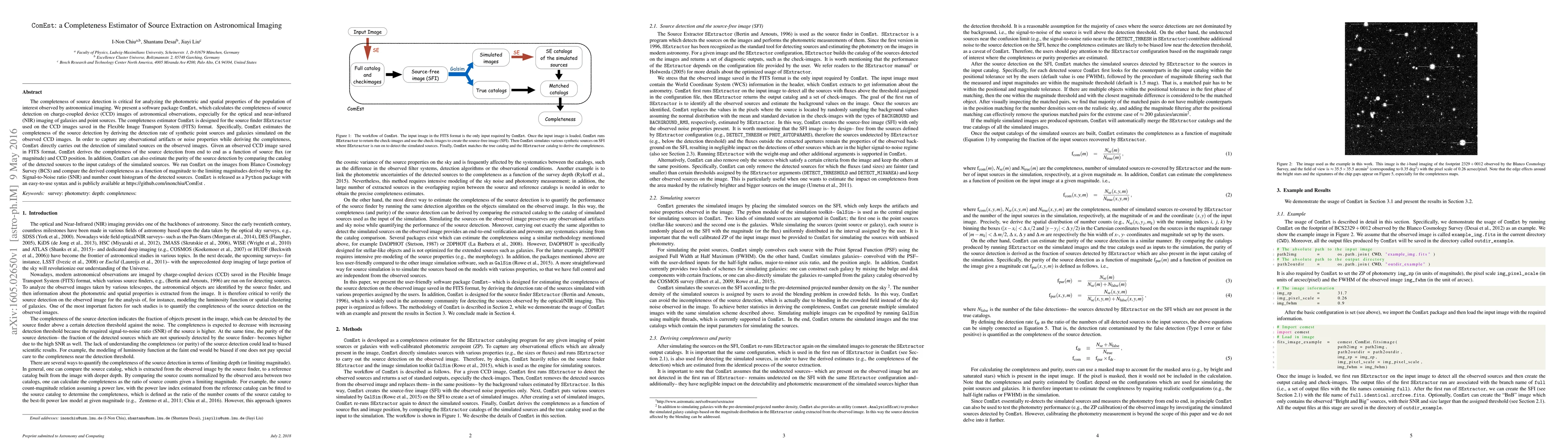 The research introduces ComEst, a Python package that estimates source detection completeness in astronomical imaging, specifically for CCD images in optical and near-infrared ranges. It works with SExtractor and FITS formatted images, calculating detection rates of synthetic sources to derive completeness as a function of flux and position. ComEst also estimates source detection purity. Tested on Blanco Cosmology Survey images, its completeness estimates were compared to SNR and number count histogram methods, demonstrating its effectiveness and accuracy.